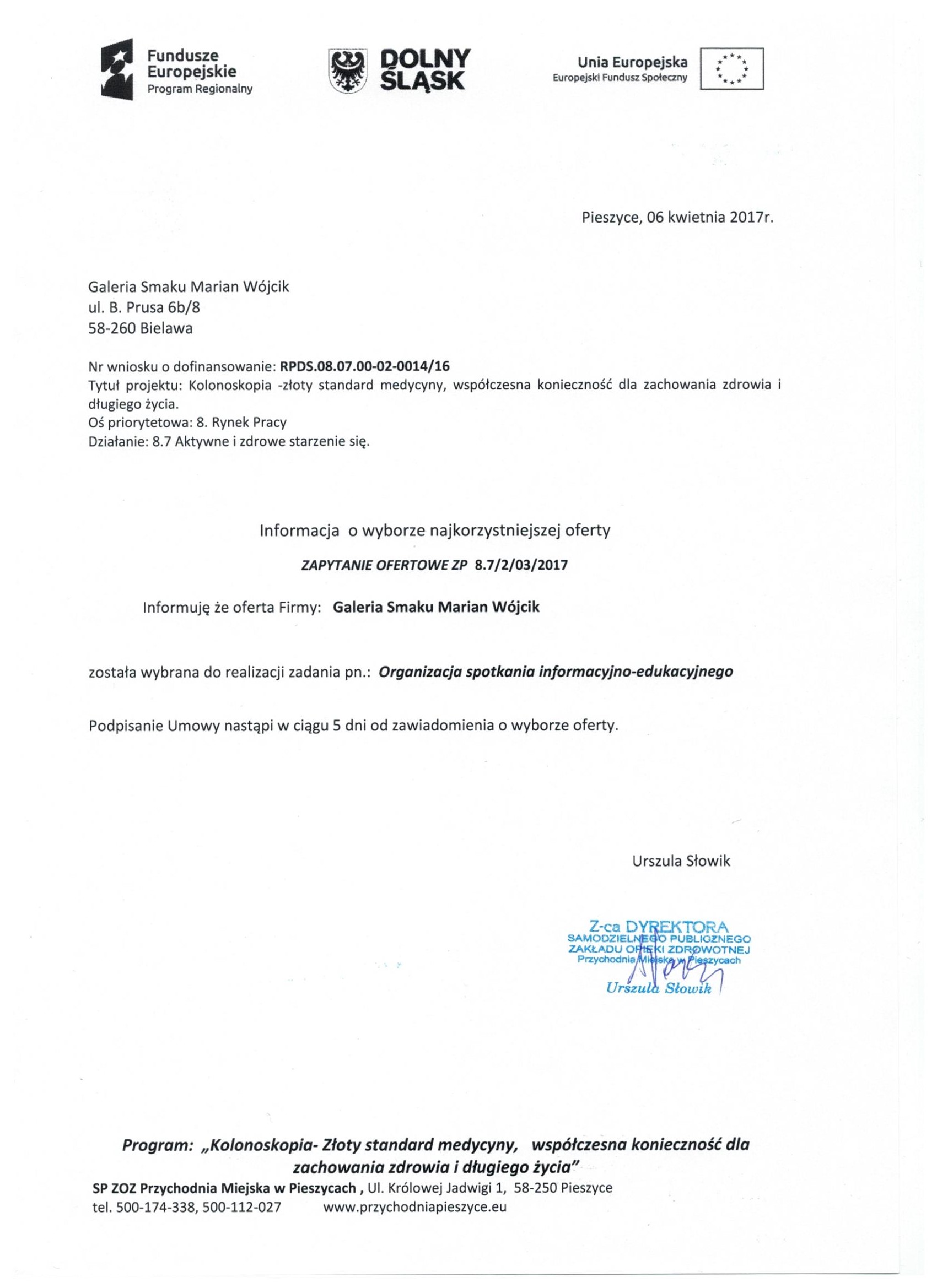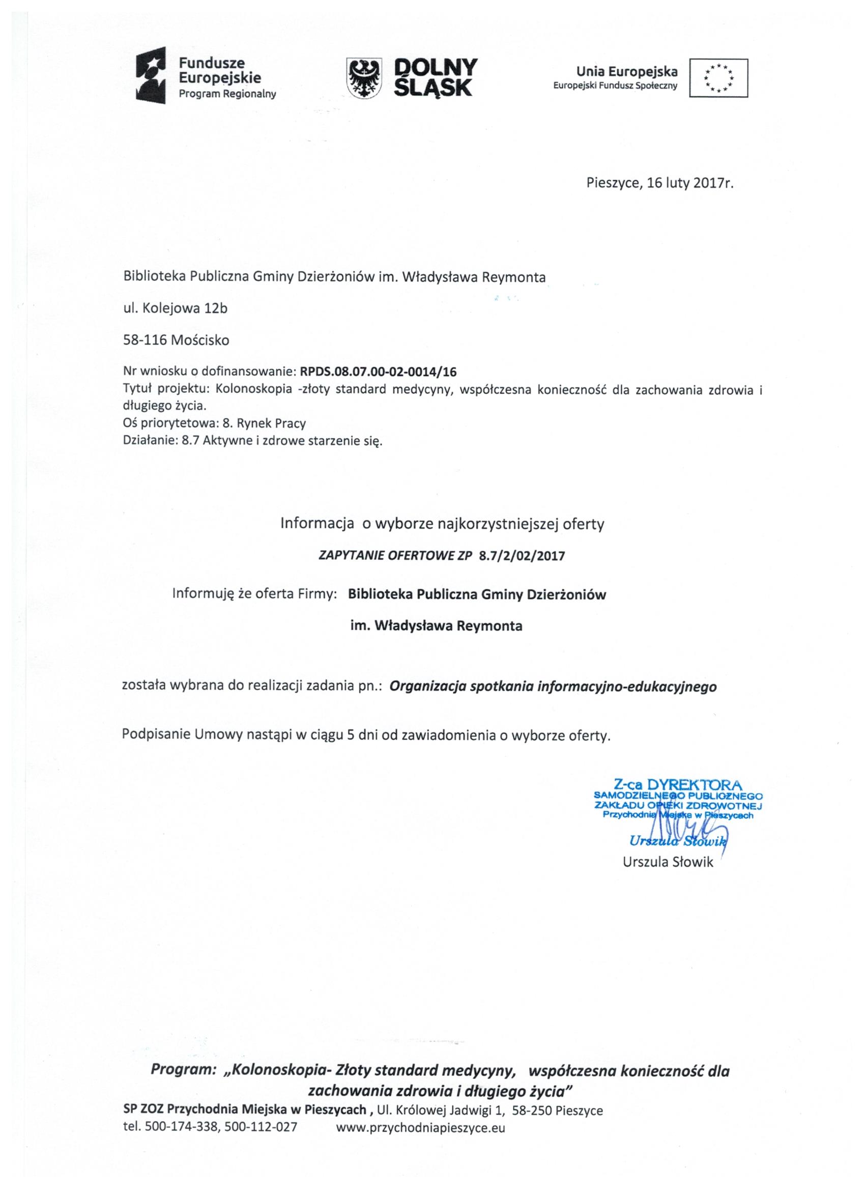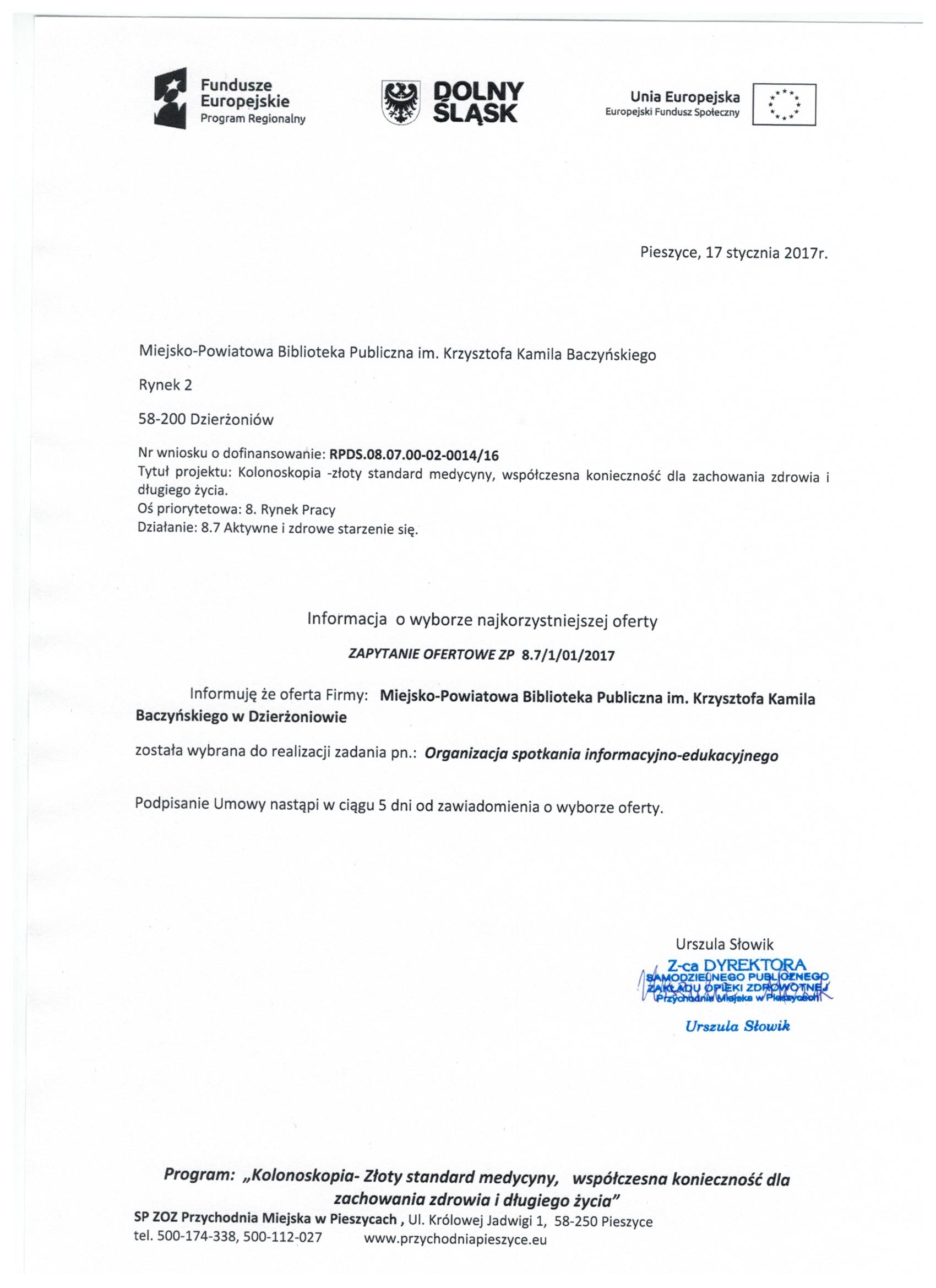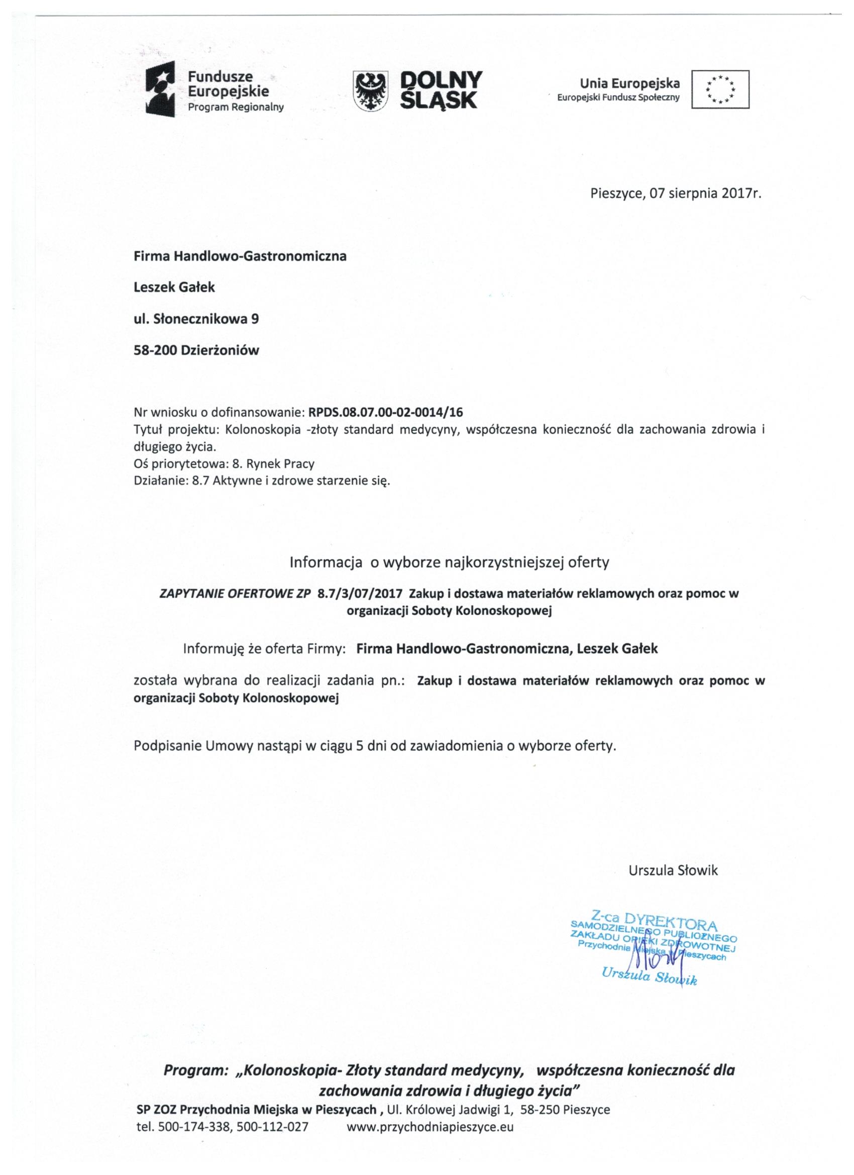 17.Wykonanie materiałów informacyjnych i promocyjnych dla projektu: Rozbudowa i nadbudowa Przychodni Miejskiej w Pieszycach (etap IV) na potrzeby opieki koordynowanej w POZ i AOS, ich produkcja oraz dostarczenie do siedziby Zamawiającego. Zał. nr 2 "Wzór fomularz oferty"- Informacja o udzieleniu zamówienia.