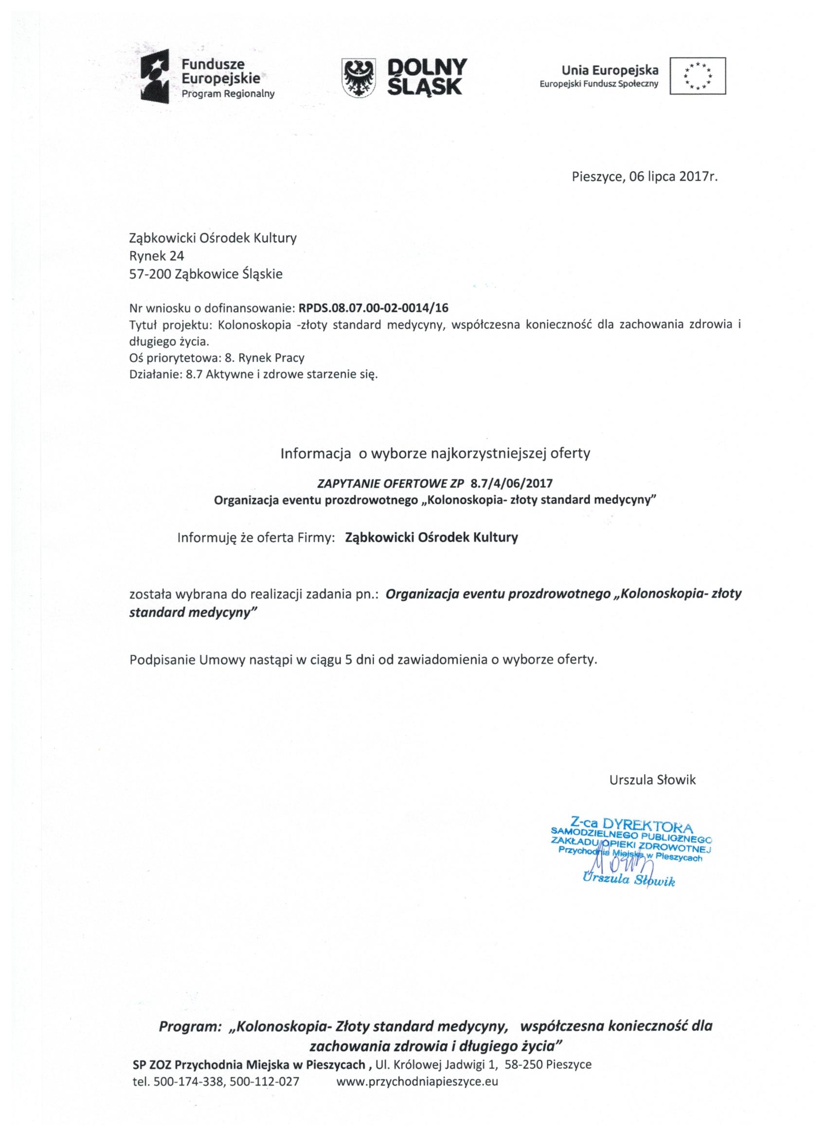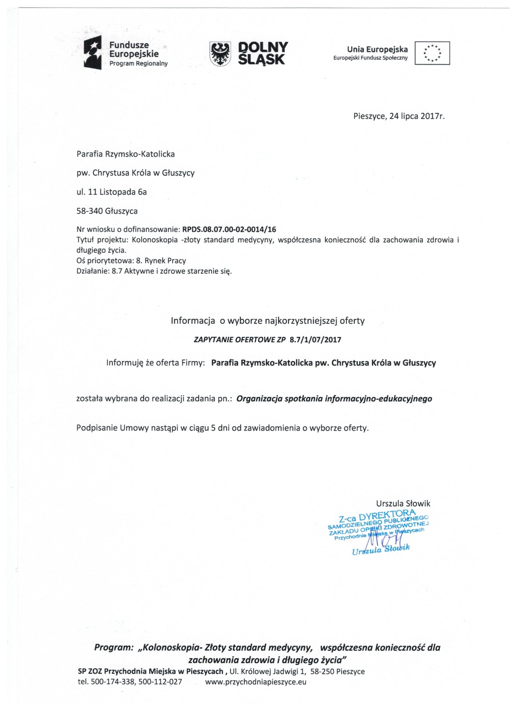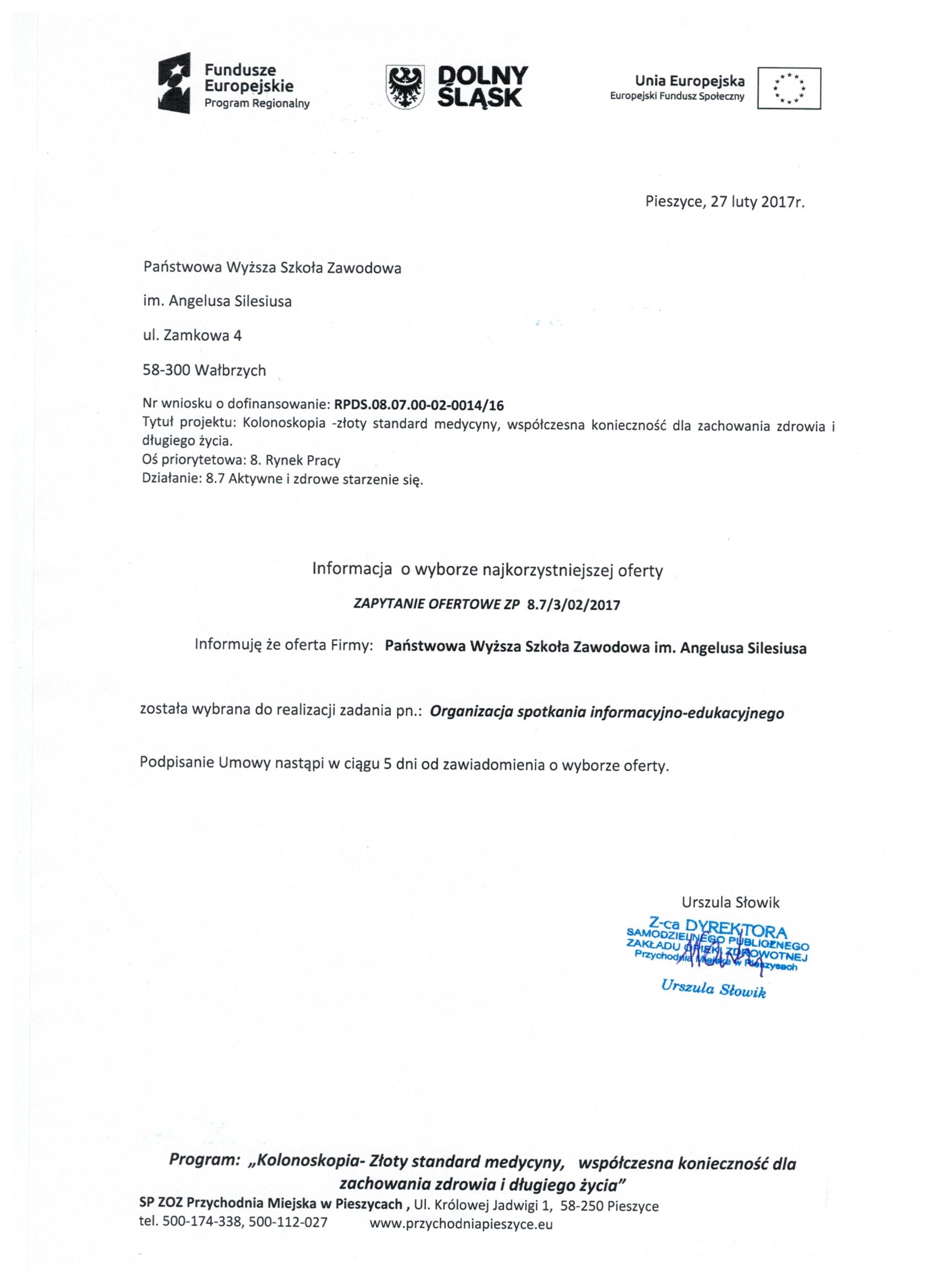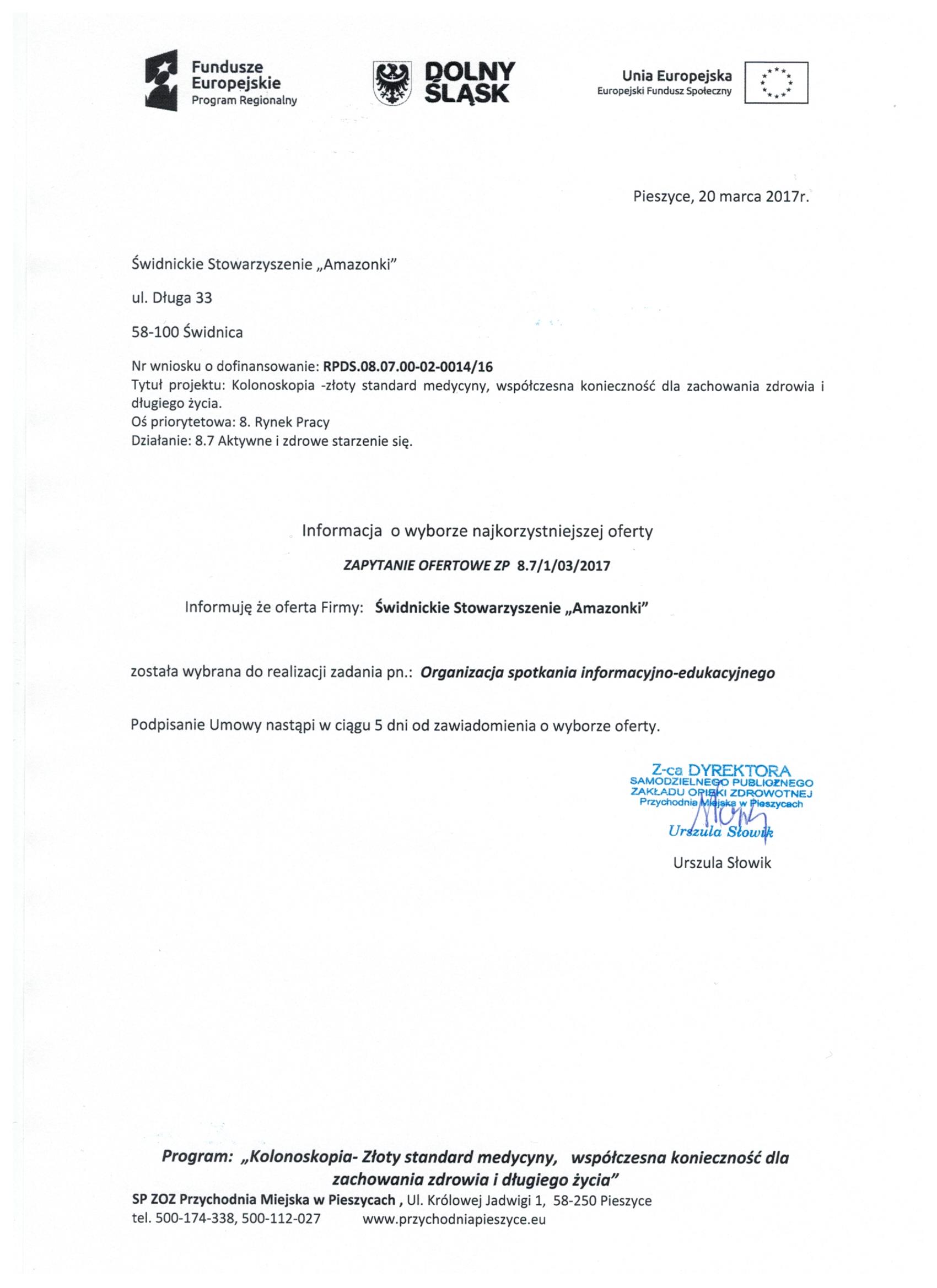 17.Wykonanie materiałów informacyjnych i promocyjnych dla projektu: Rozbudowa i nadbudowa Przychodni Miejskiej w Pieszycach (etap IV) na potrzeby opieki koordynowanej w POZ i AOS, ich produkcja oraz dostarczenie do siedziby Zamawiającego. Zał. nr 2 "Wzór fomularz oferty"- Informacja o udzieleniu zamówienia.