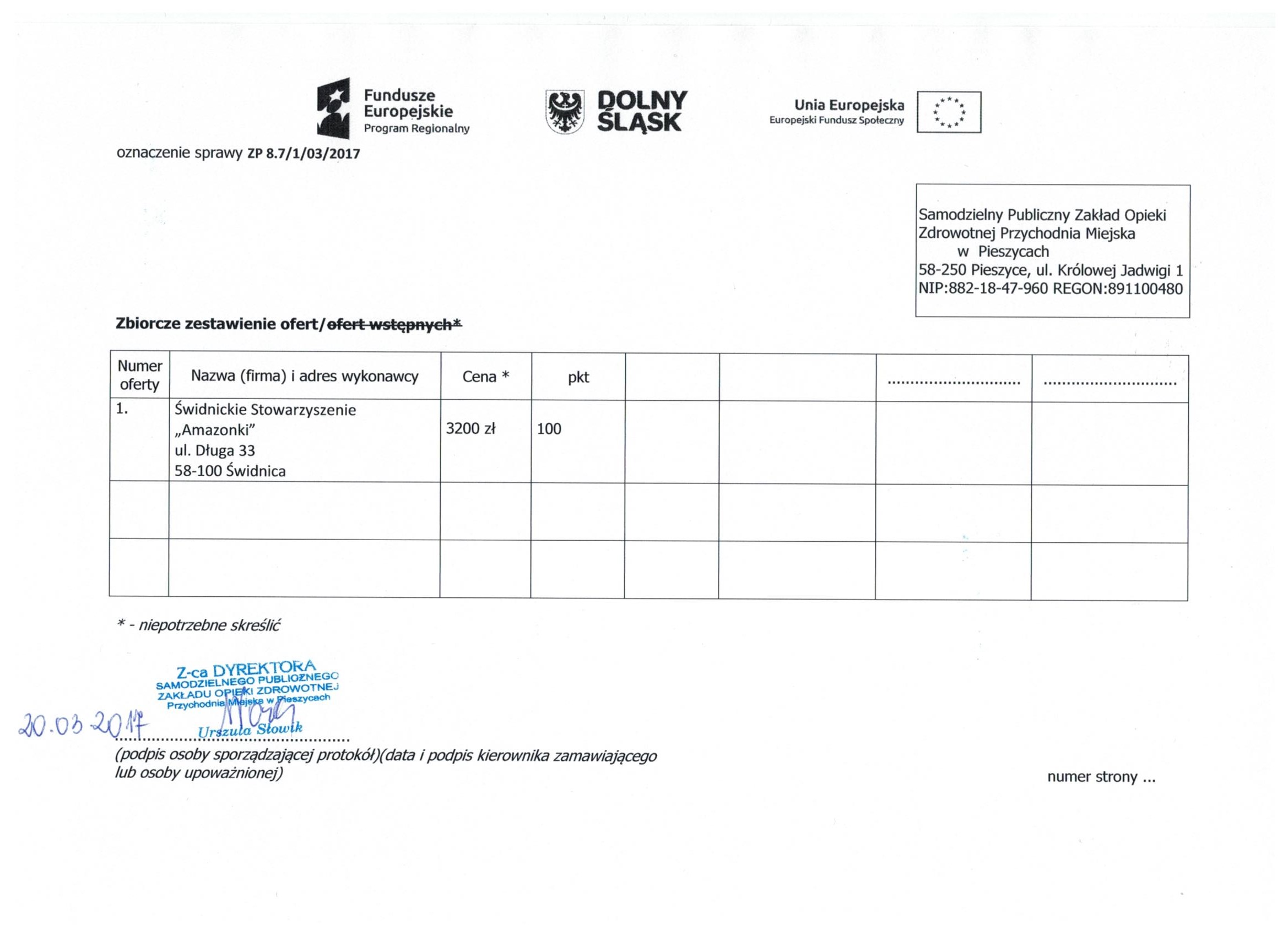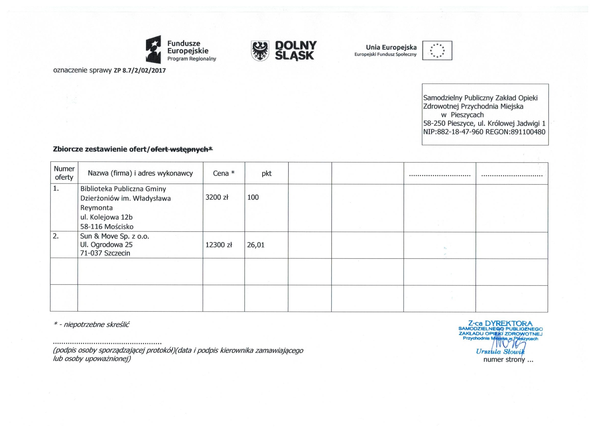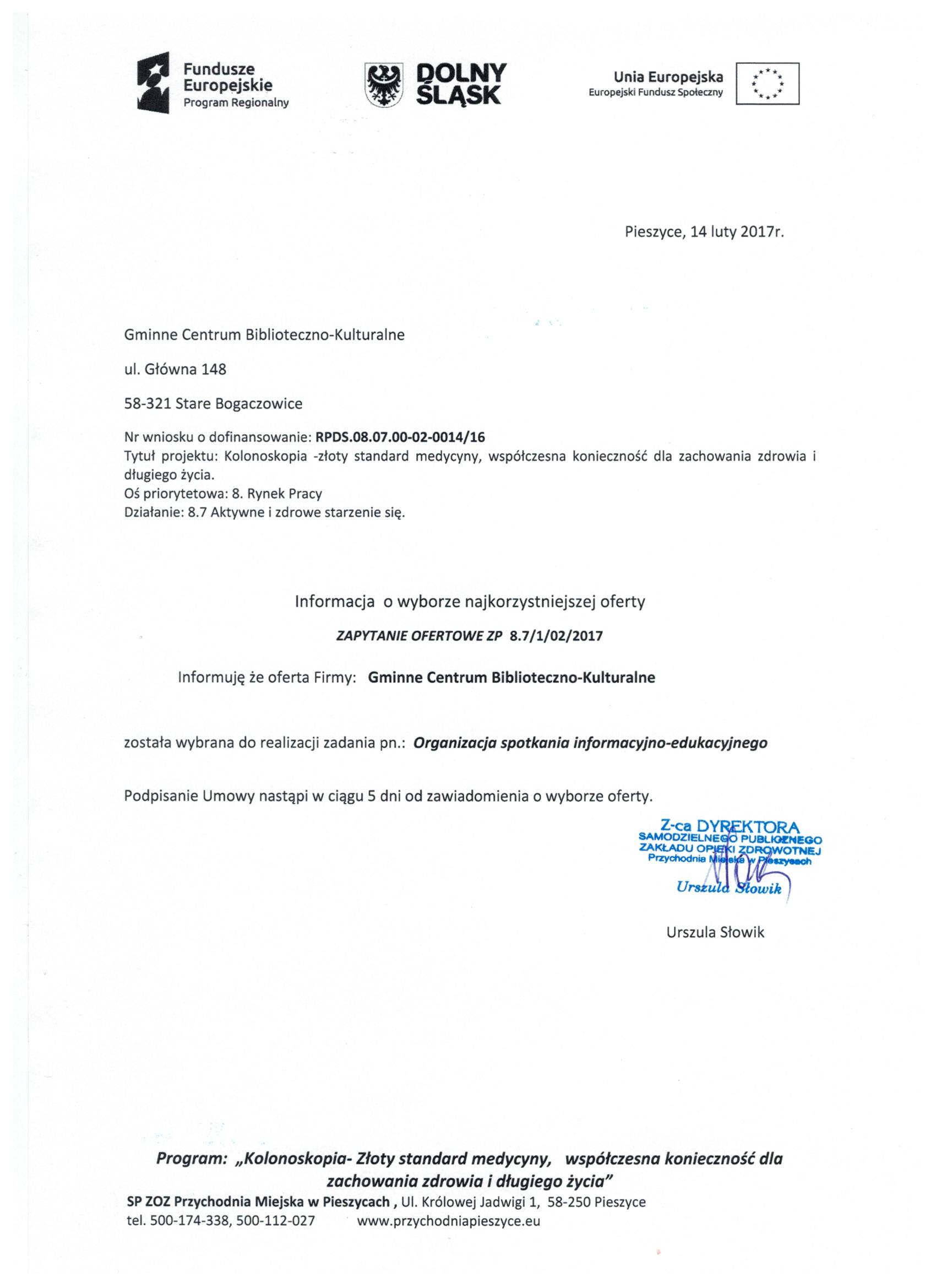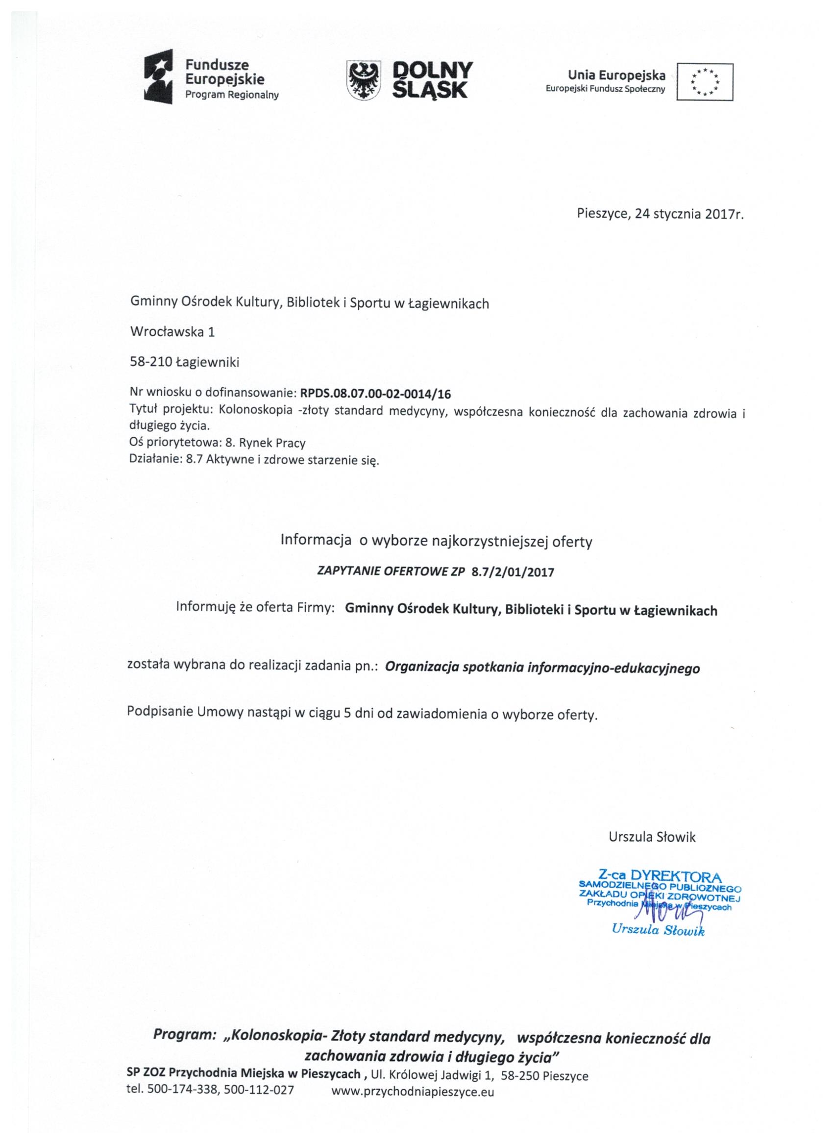 17.Wykonanie materiałów informacyjnych i promocyjnych dla projektu: Rozbudowa i nadbudowa Przychodni Miejskiej w Pieszycach (etap IV) na potrzeby opieki koordynowanej w POZ i AOS, ich produkcja oraz dostarczenie do siedziby Zamawiającego. Zał. nr 2 "Wzór fomularz oferty"- Informacja o udzieleniu zamówienia.