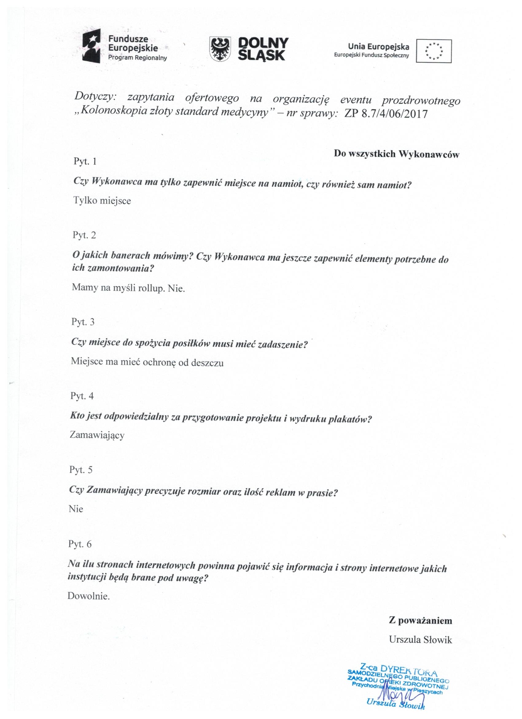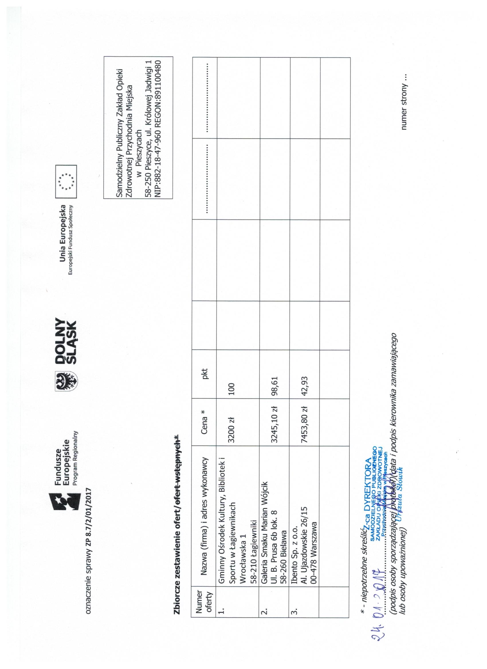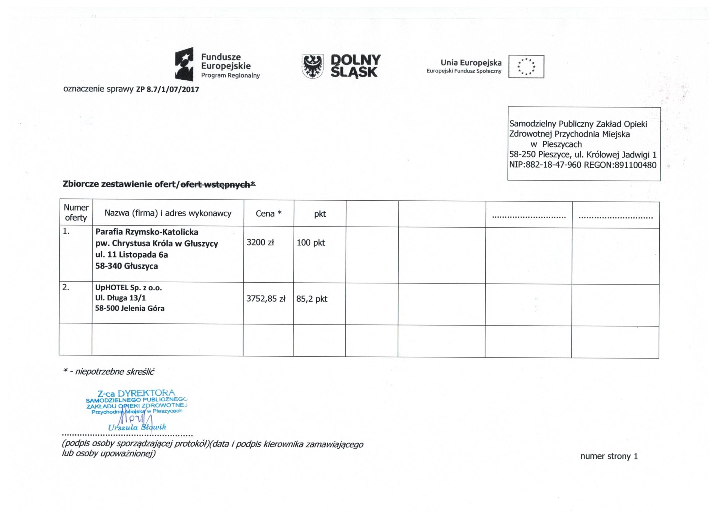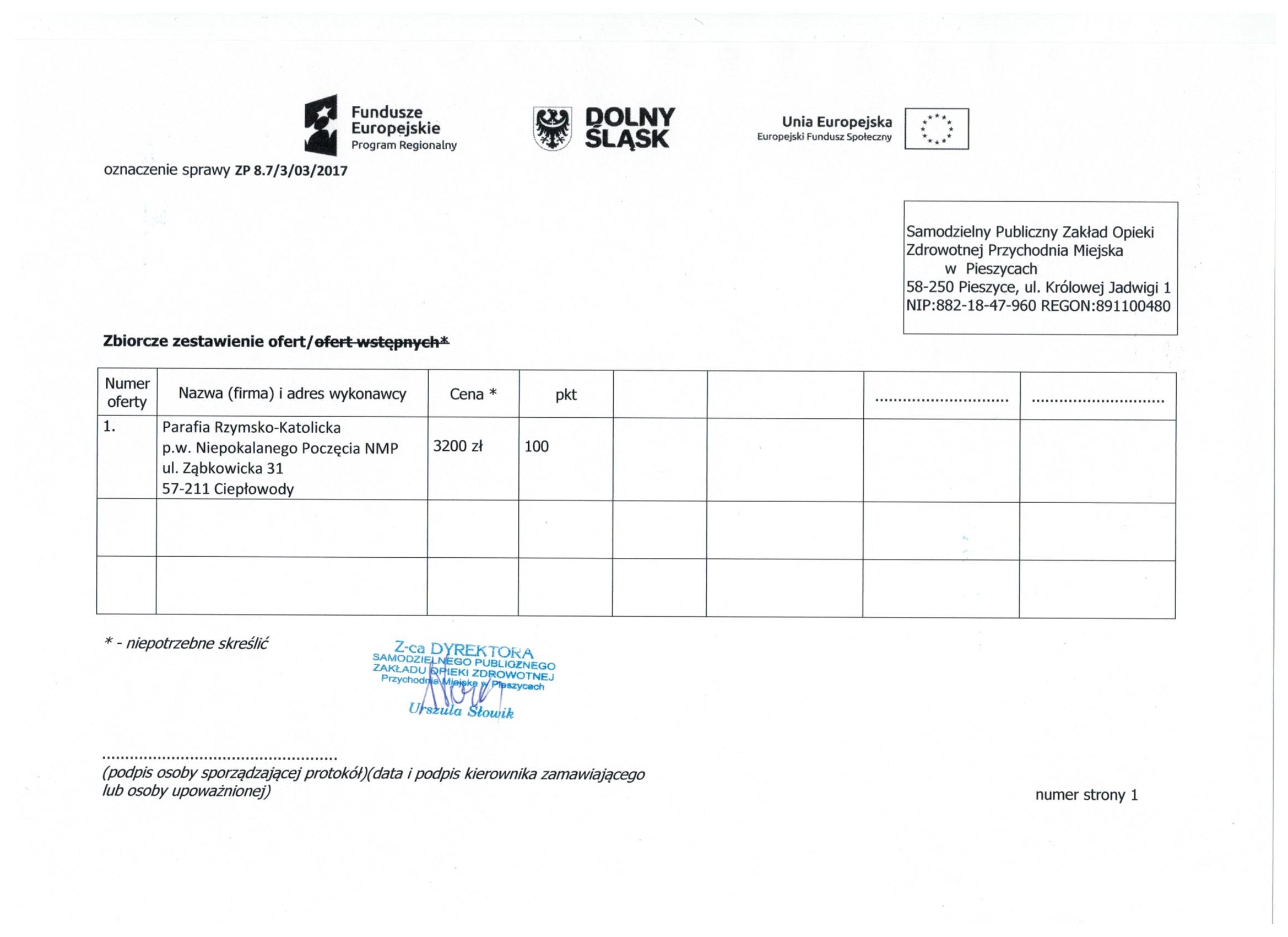 17.Wykonanie materiałów informacyjnych i promocyjnych dla projektu: Rozbudowa i nadbudowa Przychodni Miejskiej w Pieszycach (etap IV) na potrzeby opieki koordynowanej w POZ i AOS, ich produkcja oraz dostarczenie do siedziby Zamawiającego. Zał. nr 2 "Wzór fomularz oferty"- Informacja o udzieleniu zamówienia.