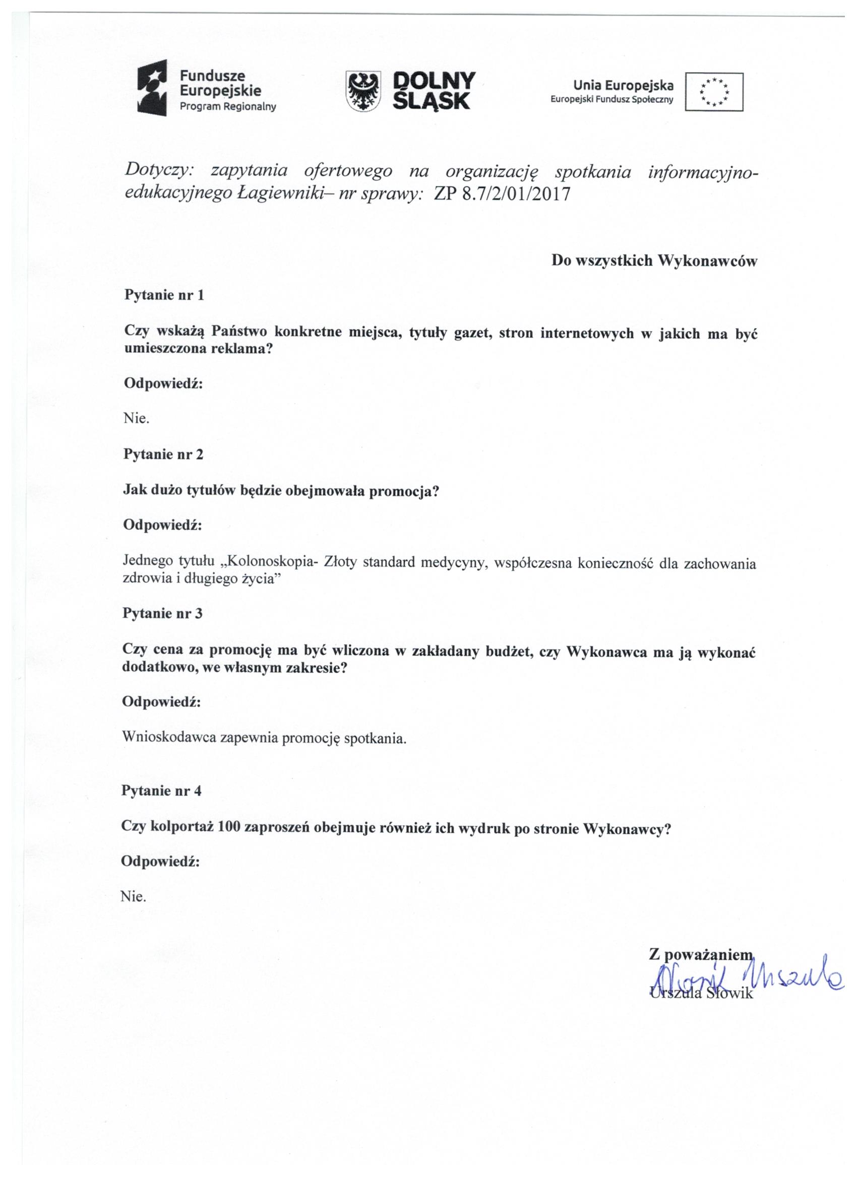 11. Zapytanie ofertowe - spotkanie Ząbkowice Śląskie - Pytania i odpowiedzi - Zbiorcze zestawienie ofert - Informacja o wyborze oferty