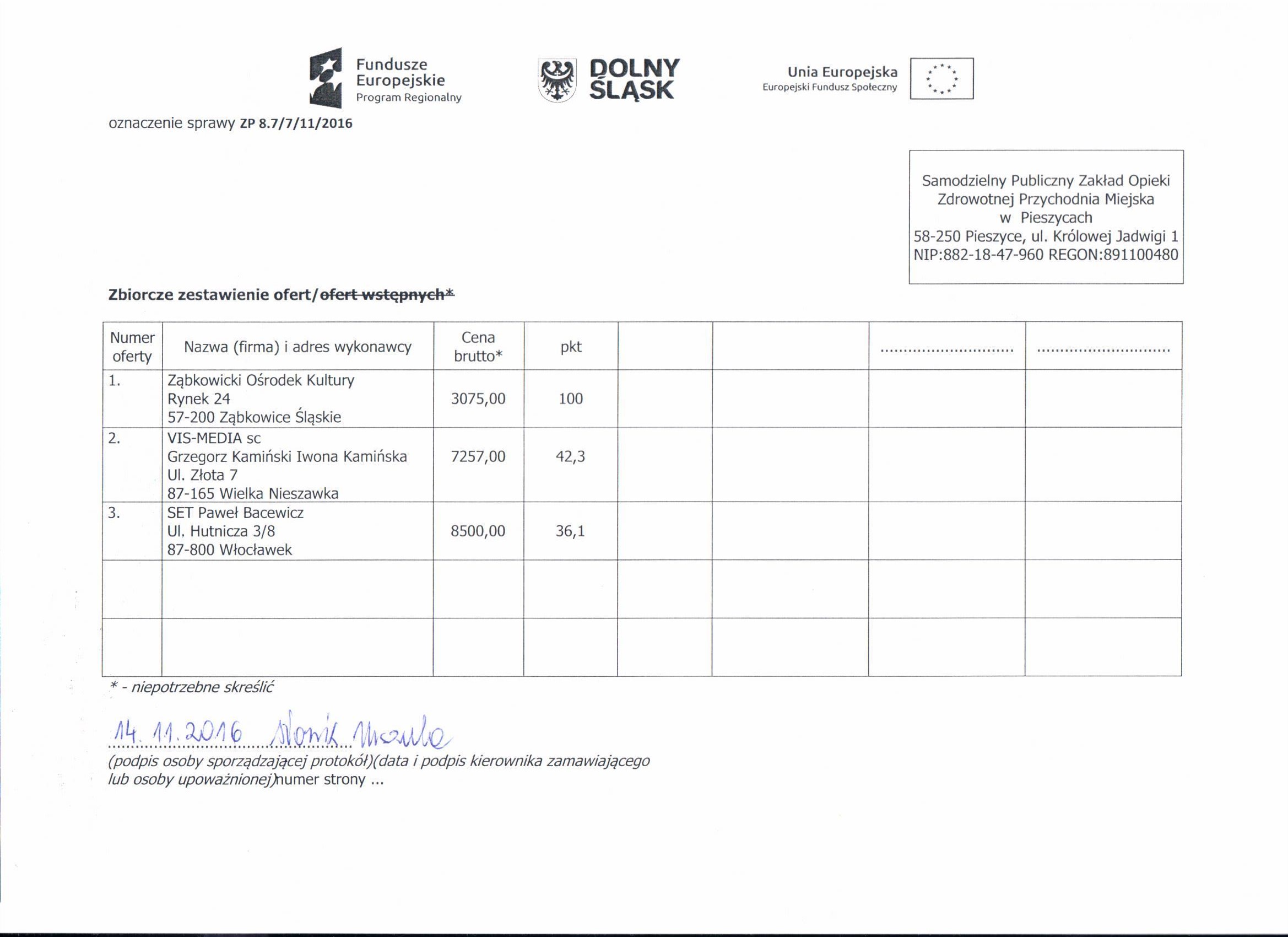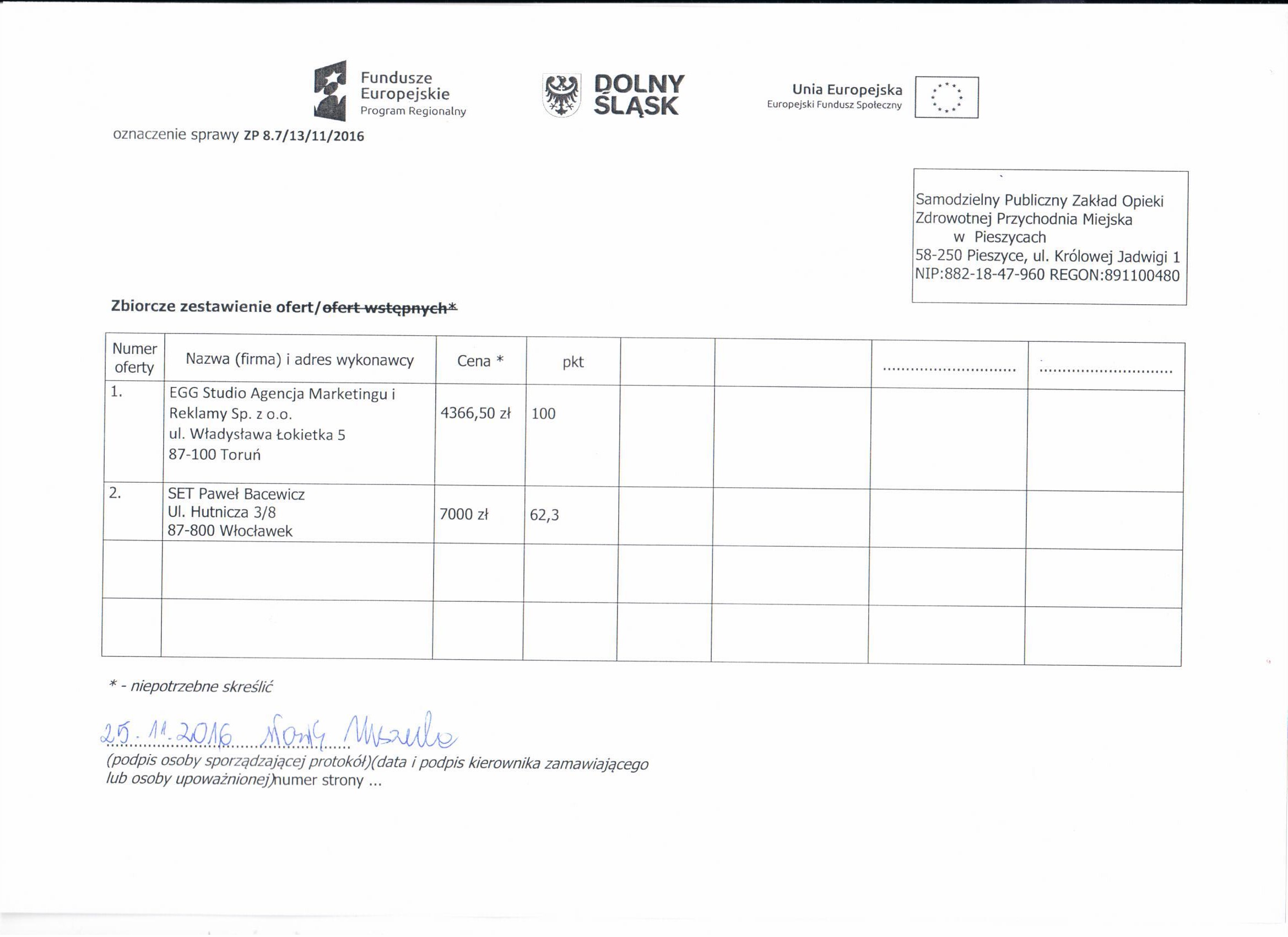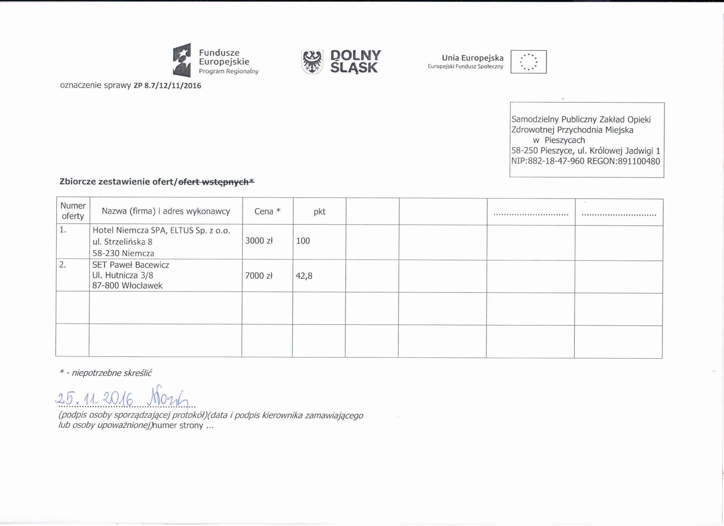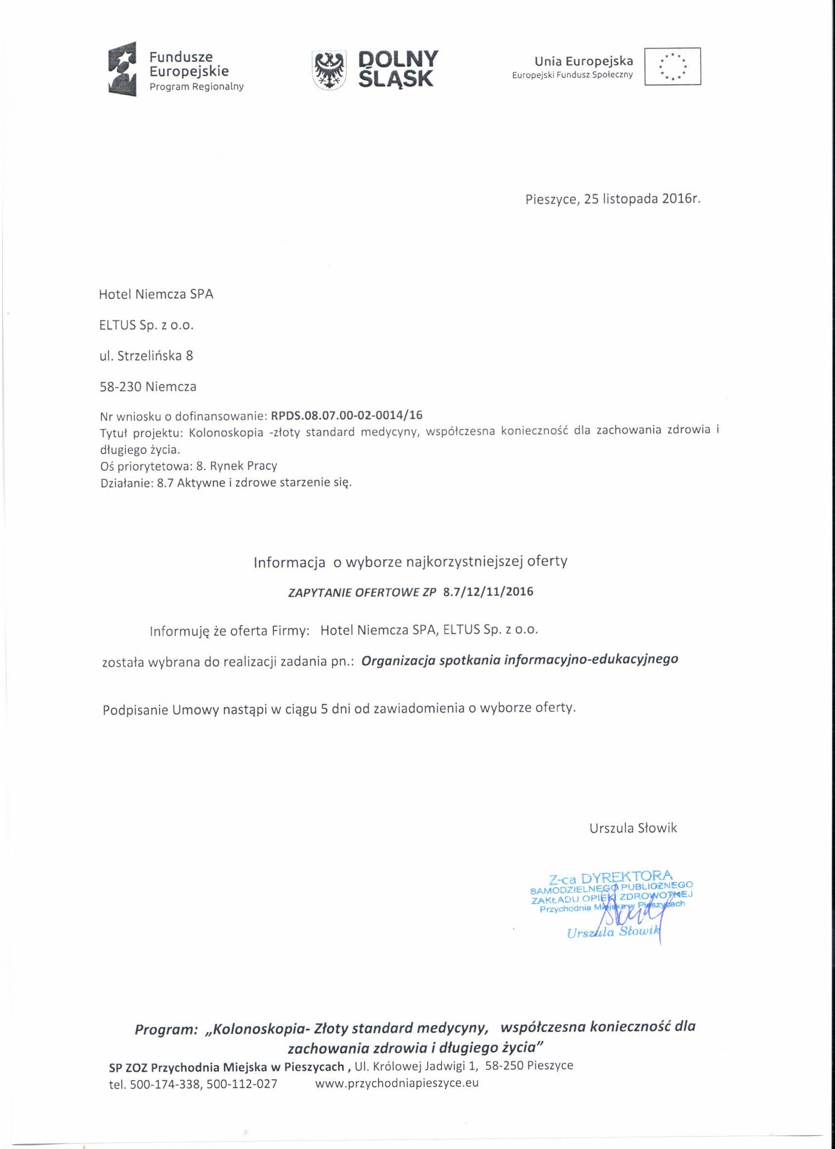 7. Zapytanie ofertowe - spotkanie Niemcza - Zestawienie ofert - Informacja o wyborze najkorzystniejszej oferty