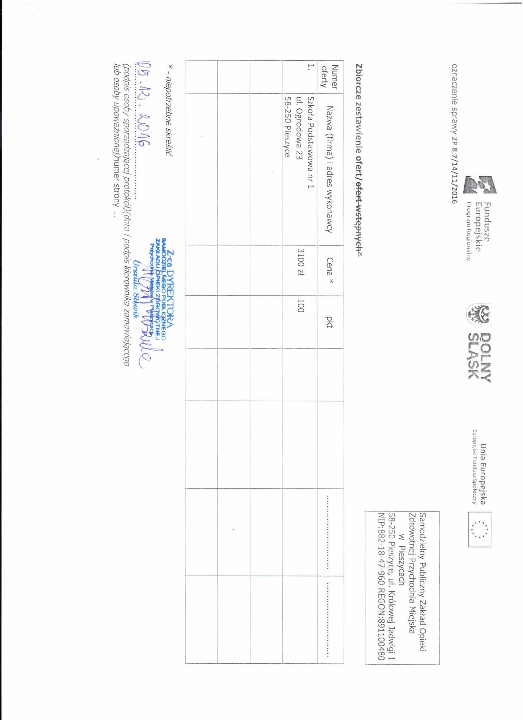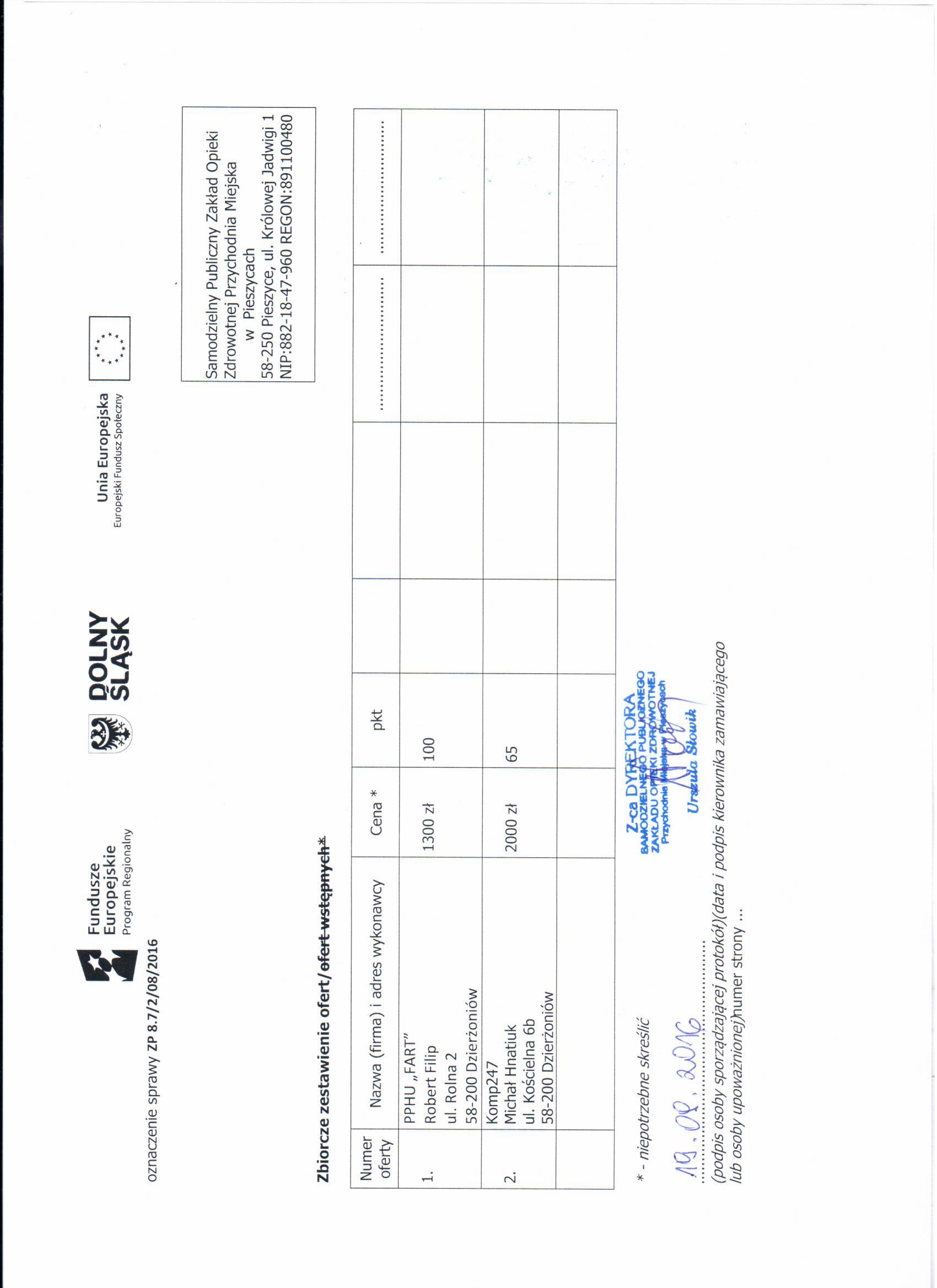 5. Zapytanie ofertowe - spotkanie Kudowa Zdrój - Zestawienie ofert - Informacja o wyborze najkorzystniejszej oferty
