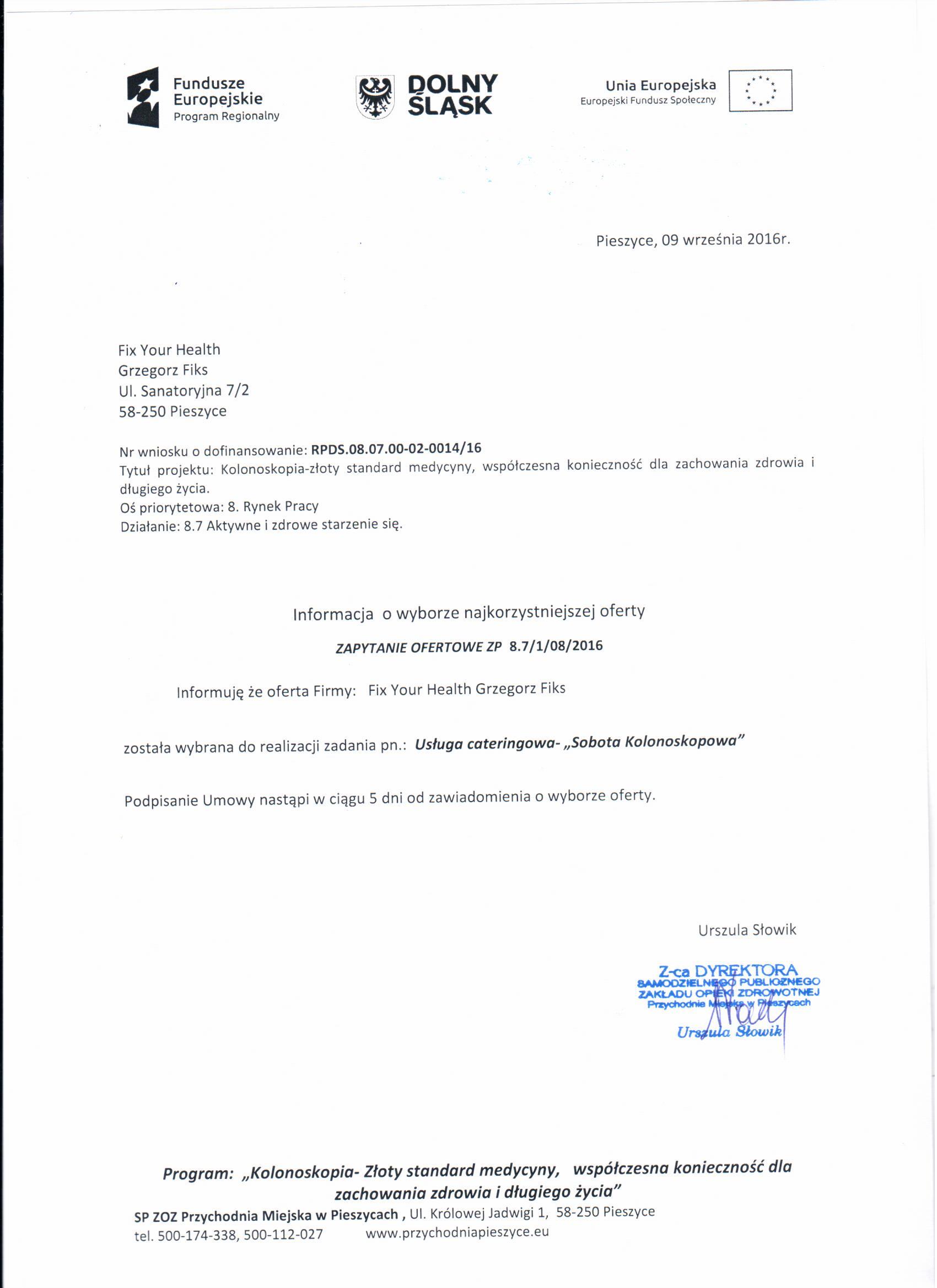1. ZAPYTANIE OFERTOWE - SOBOTA KOLONOSKOPOWA - Zestawienie ofert -Informacja o wyborze najkorzystniejszej oferty