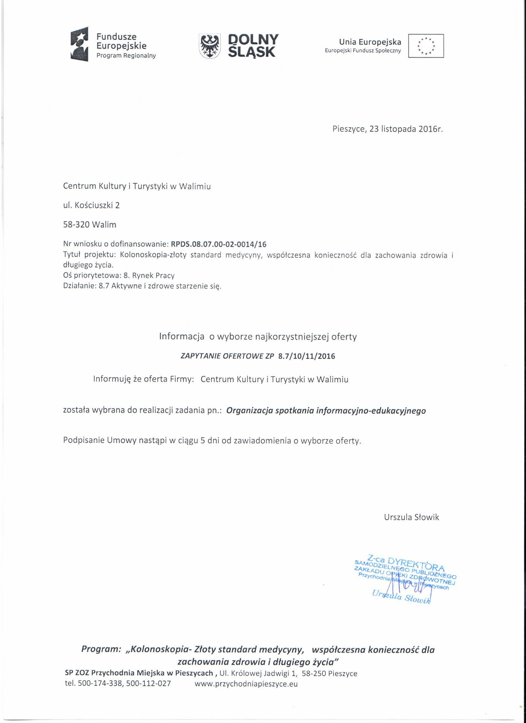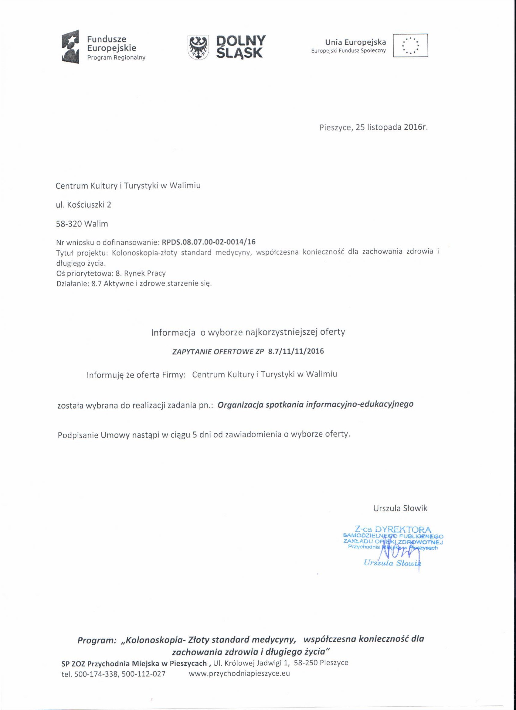 8. Zapytanie ofertowe - spotkanie Walim - Zestawienie ofert - Informacja o wyborze najkorzystniejszej oferty