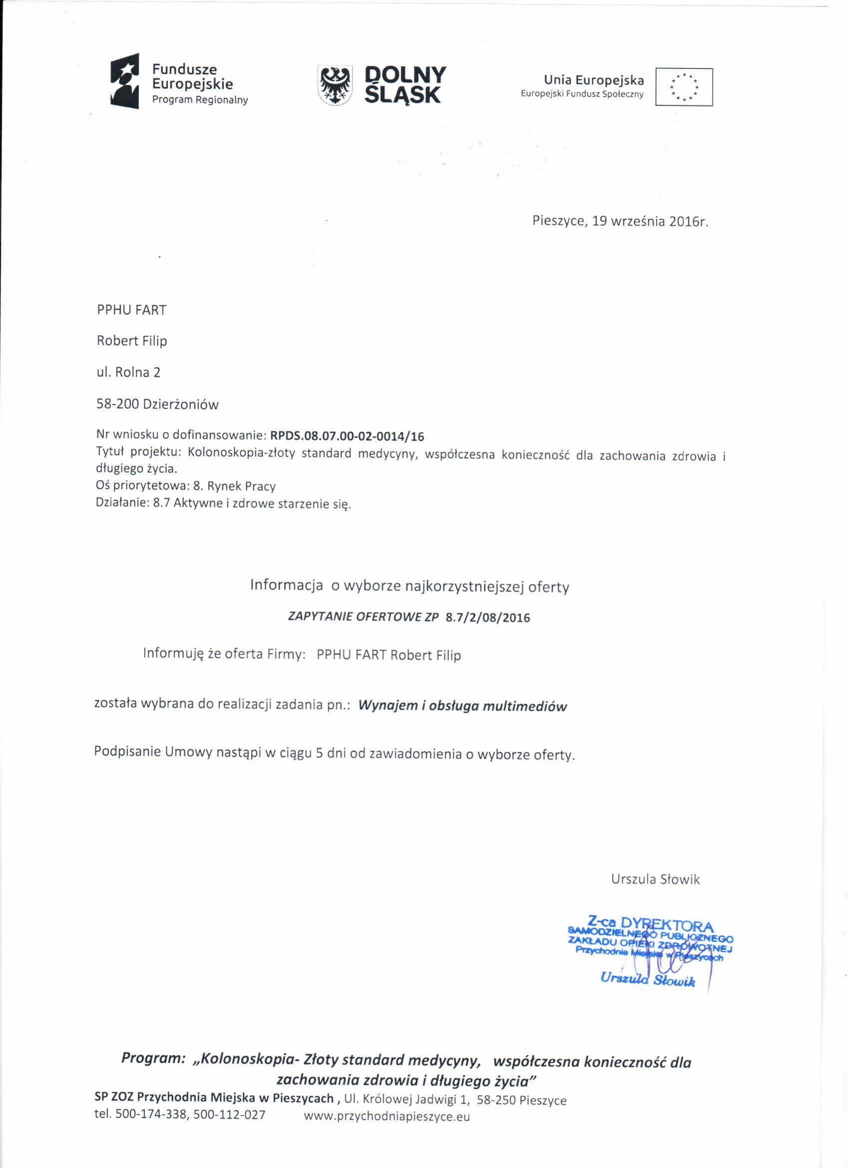 2. ZAPYTANIE OFERTOWE - SOBOTA KOLONOSKOPOWA (Wynajem i obsługa multimediów) - Zestawienie ofert - Informacja o wyborze najkorzystniejszej oferty