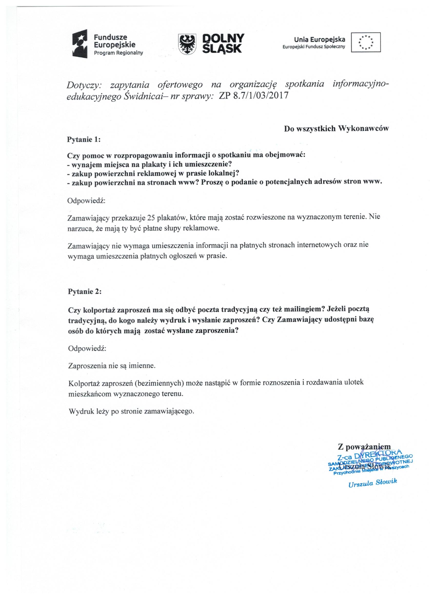 6. Zapytanie ofertowe - spotkanie Świdnica - Pytania - Zestawienie ofert - Informacja o wyborze oferty
