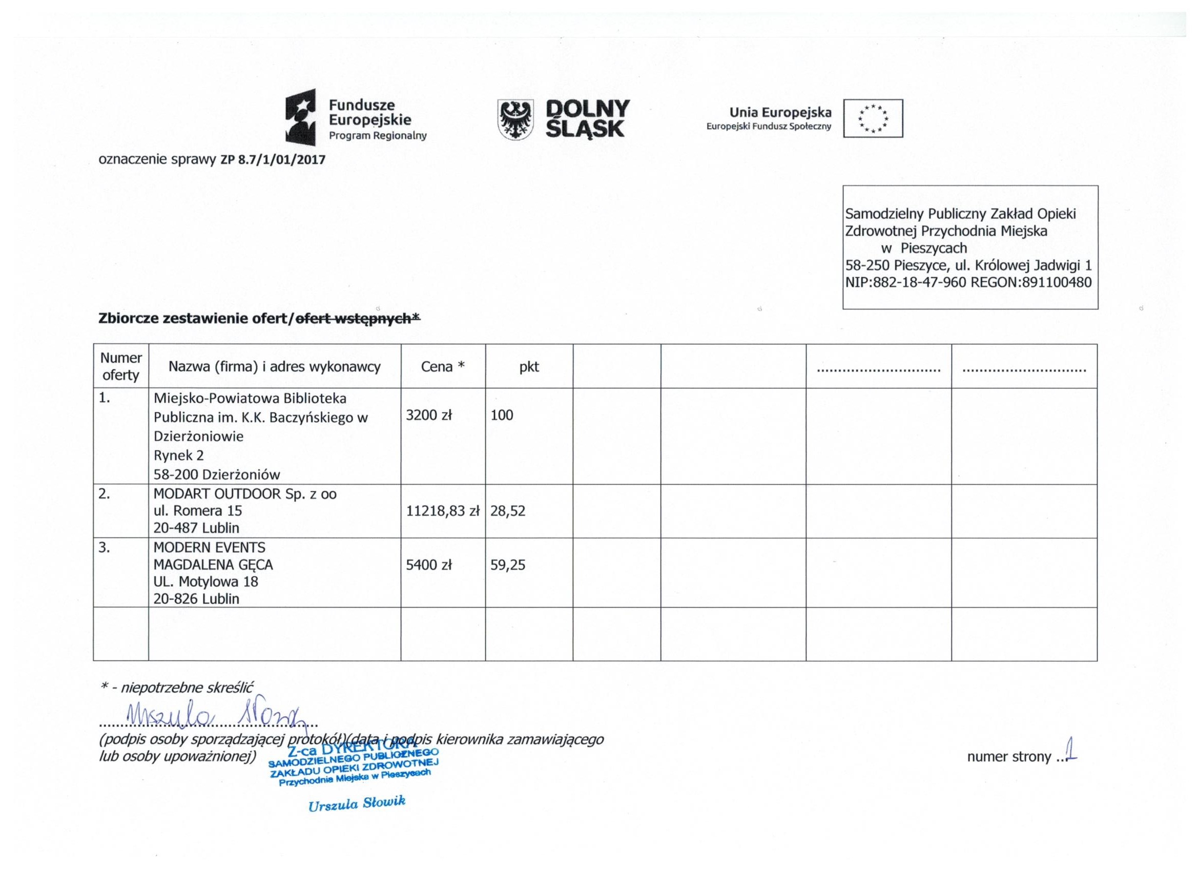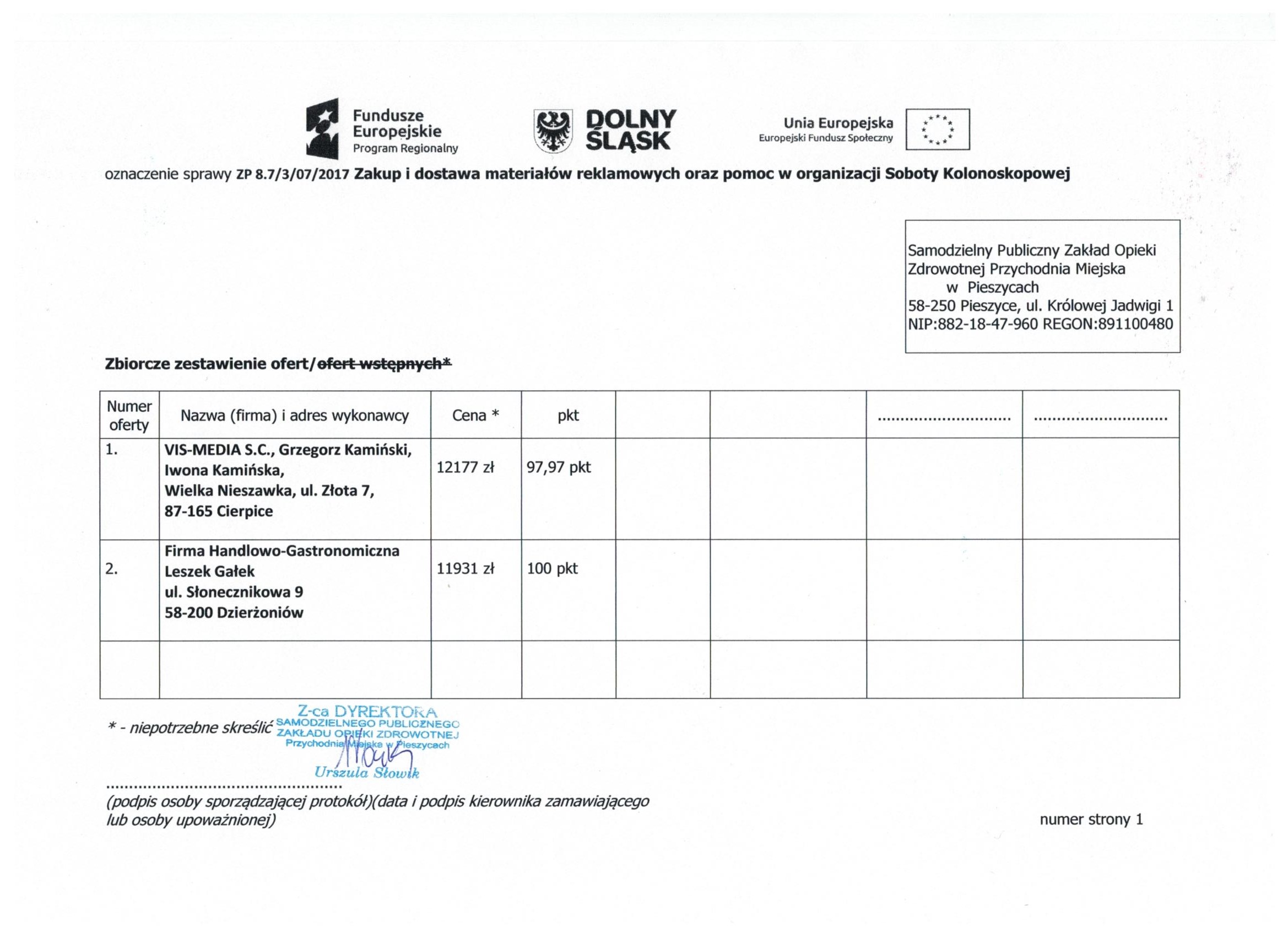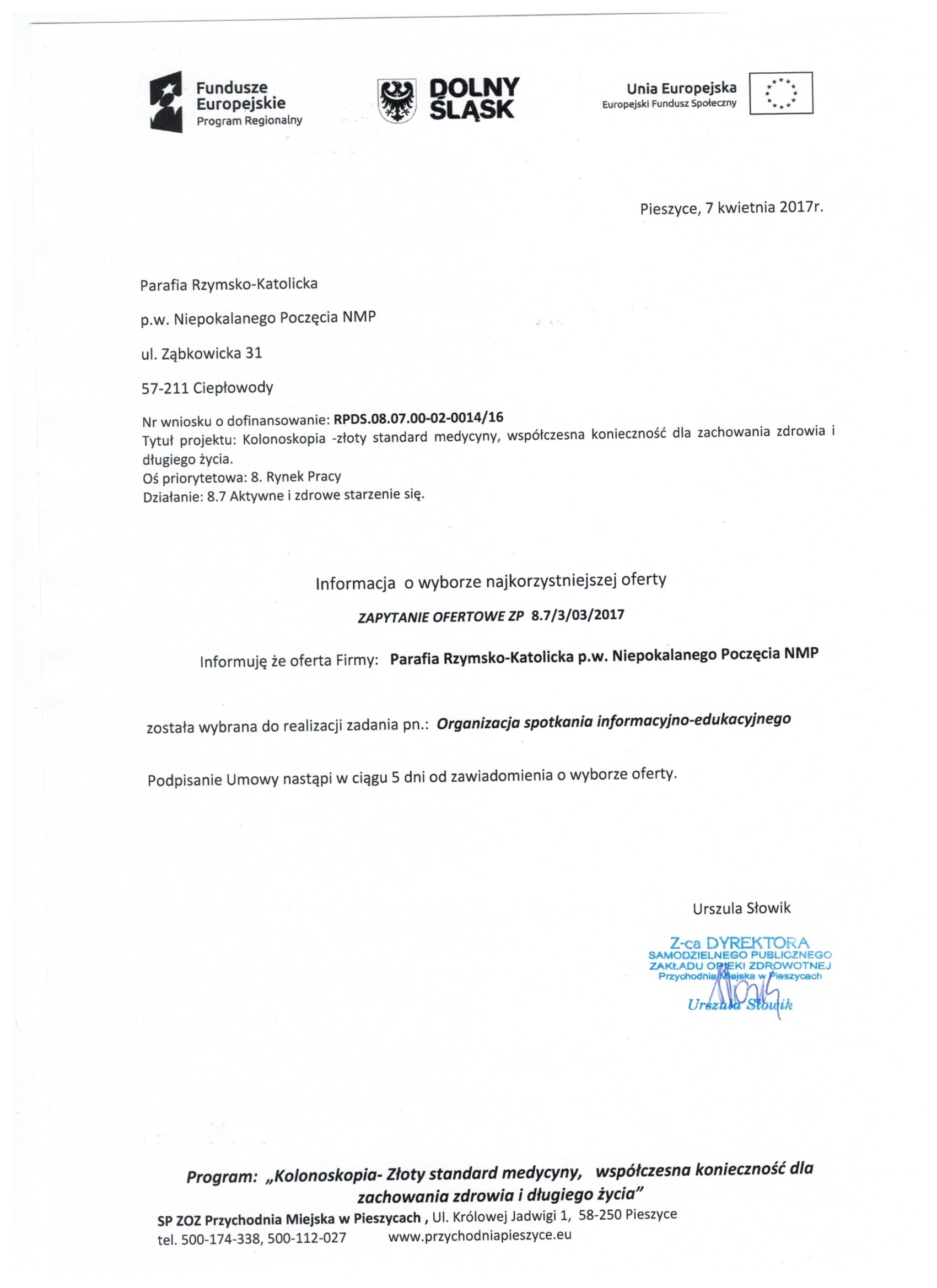 17.Wykonanie materiałów informacyjnych i promocyjnych dla projektu: Rozbudowa i nadbudowa Przychodni Miejskiej w Pieszycach (etap IV) na potrzeby opieki koordynowanej w POZ i AOS, ich produkcja oraz dostarczenie do siedziby Zamawiającego. Zał. nr 2 "Wzór fomularz oferty"- Informacja o udzieleniu zamówienia.