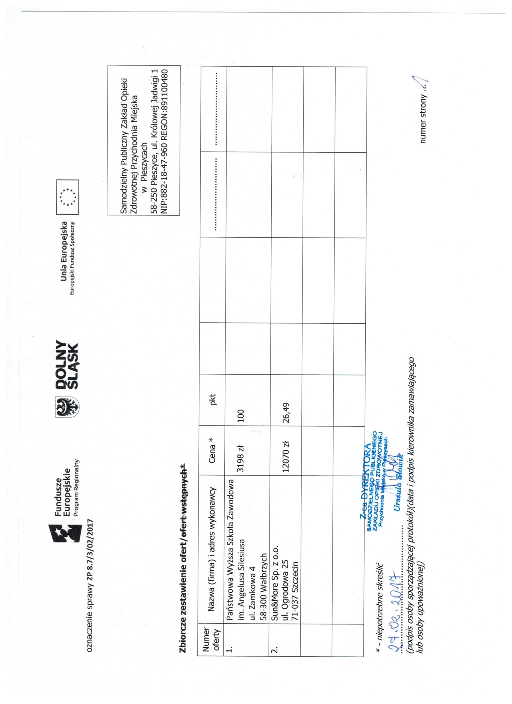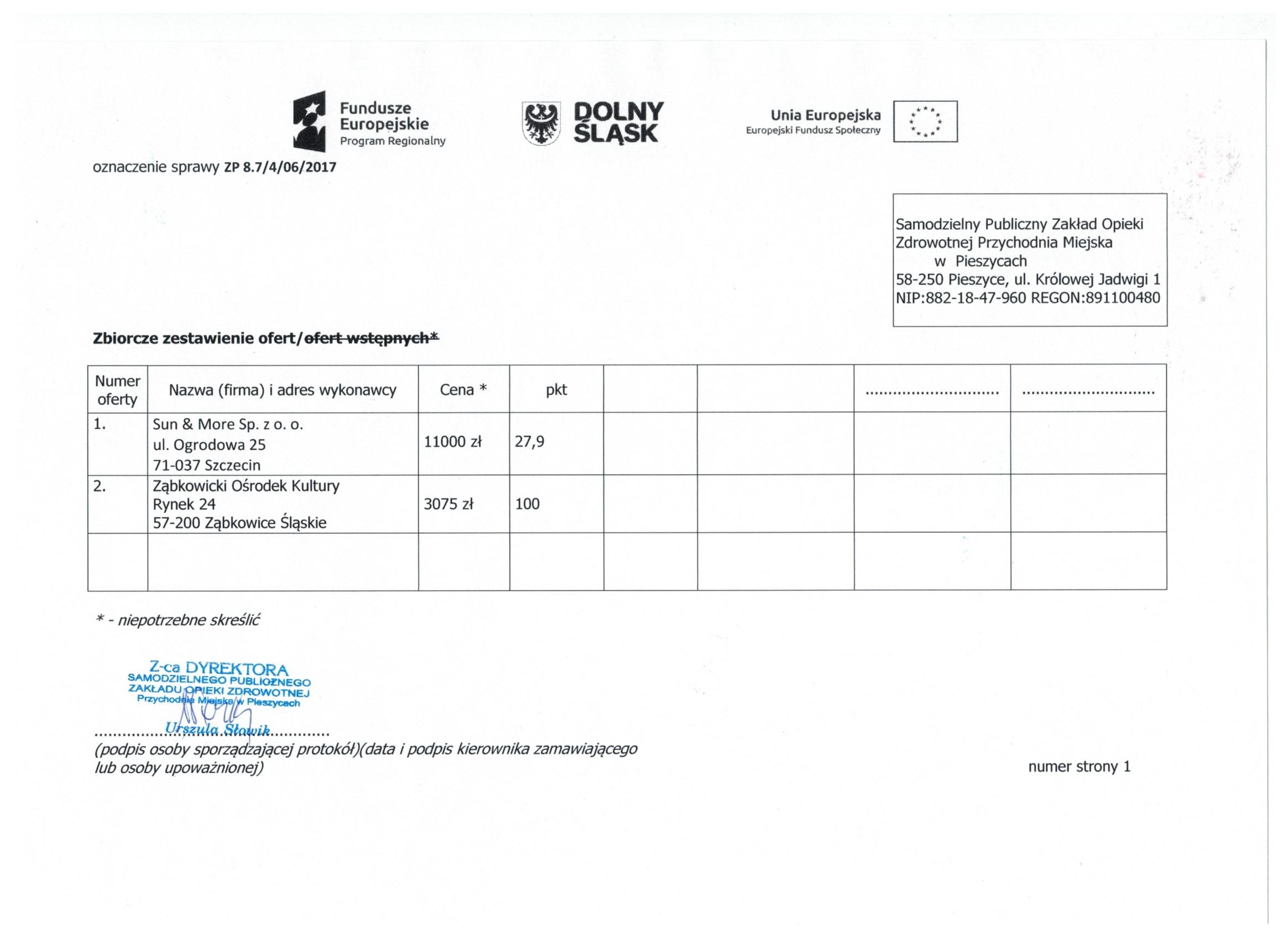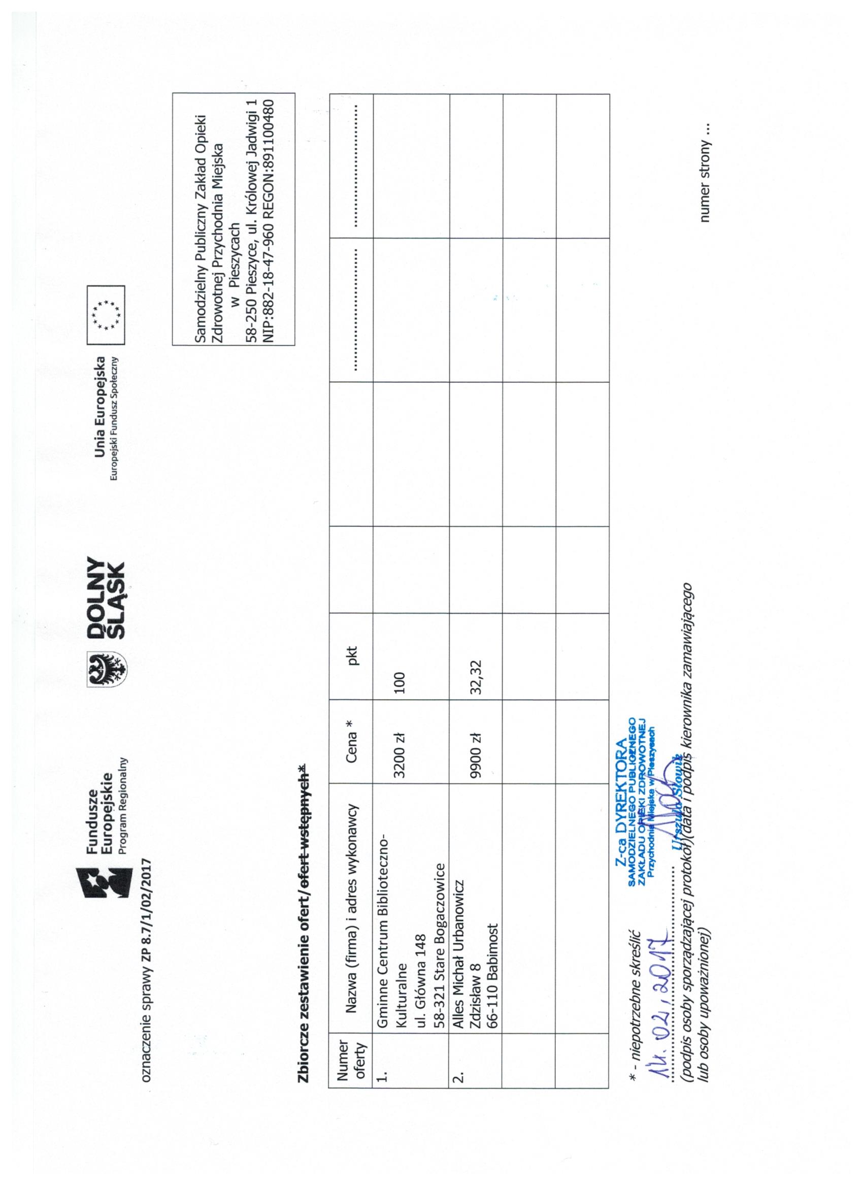 17.Wykonanie materiałów informacyjnych i promocyjnych dla projektu: Rozbudowa i nadbudowa Przychodni Miejskiej w Pieszycach (etap IV) na potrzeby opieki koordynowanej w POZ i AOS, ich produkcja oraz dostarczenie do siedziby Zamawiającego. Zał. nr 2 "Wzór fomularz oferty"- Informacja o udzieleniu zamówienia.