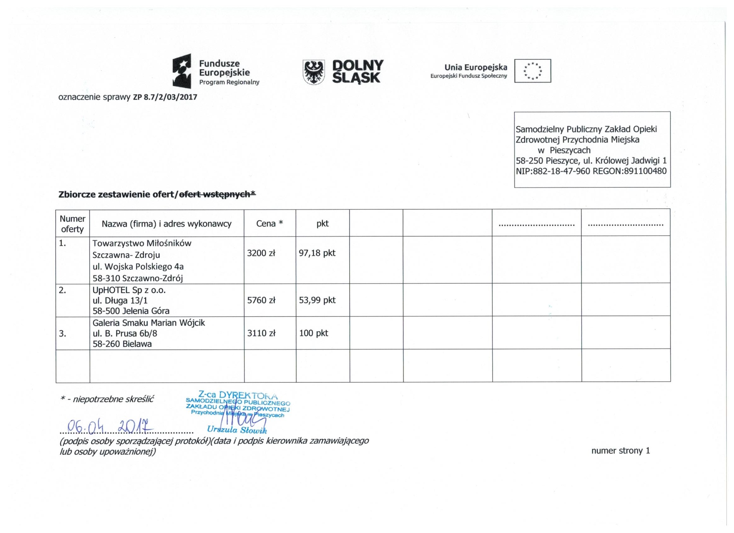7. Zapytanie ofertowe - spotkanie Szczawno-Zdrój - Zbiorcze zestawienie ofert - Informacja o wyborze oferty