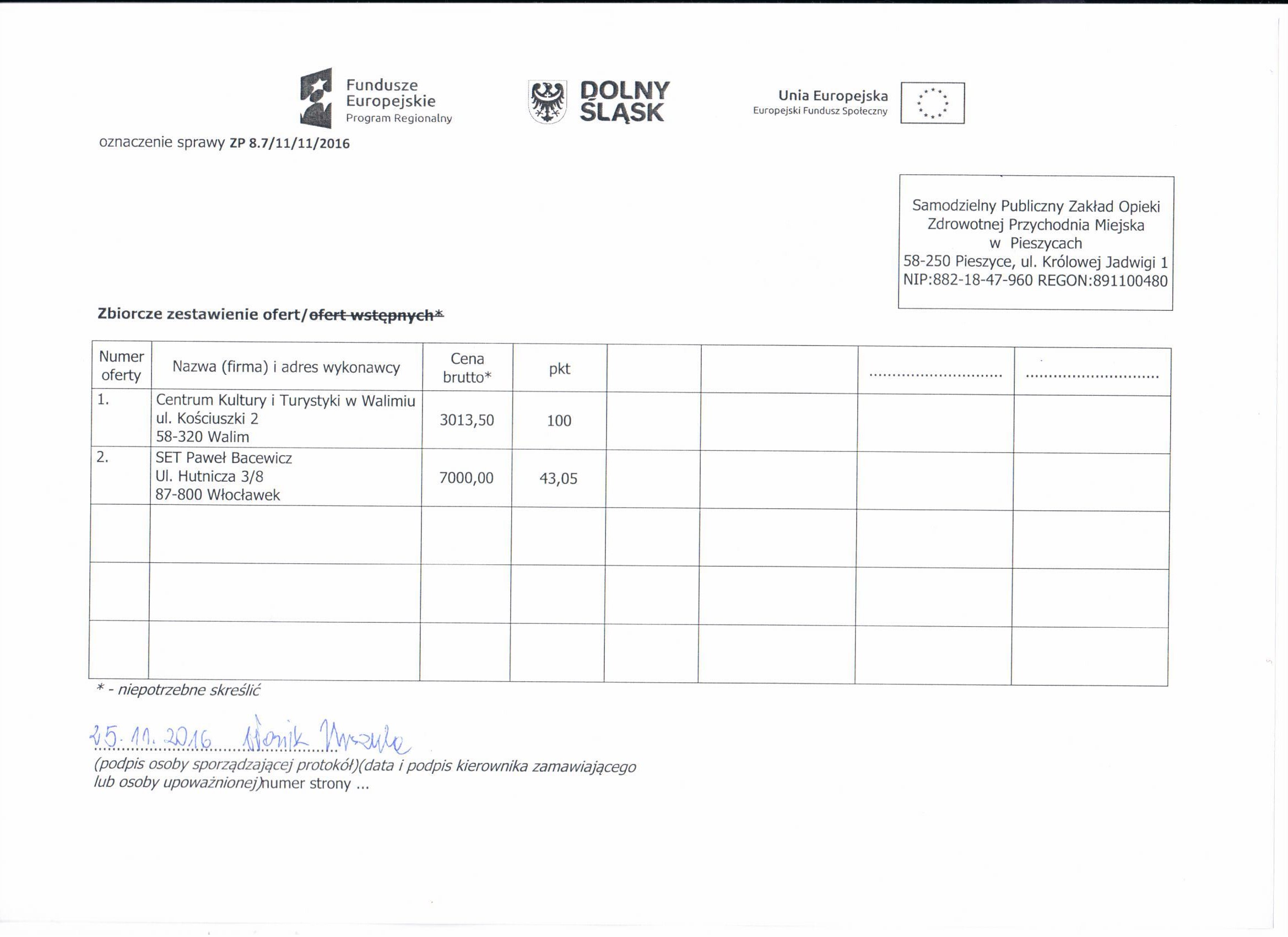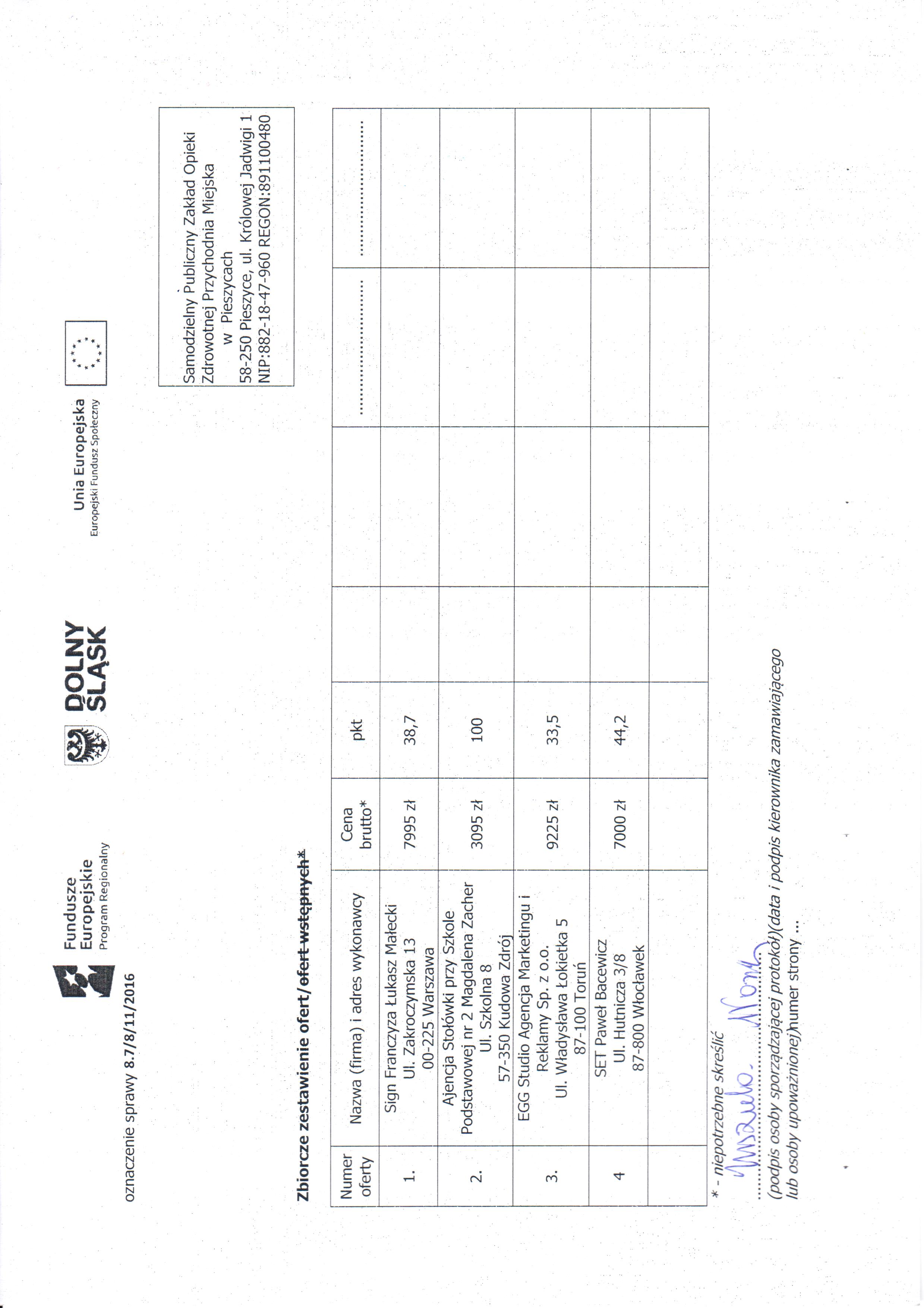 7. Zapytanie ofertowe - spotkanie Niemcza - Zestawienie ofert - Informacja o wyborze najkorzystniejszej oferty