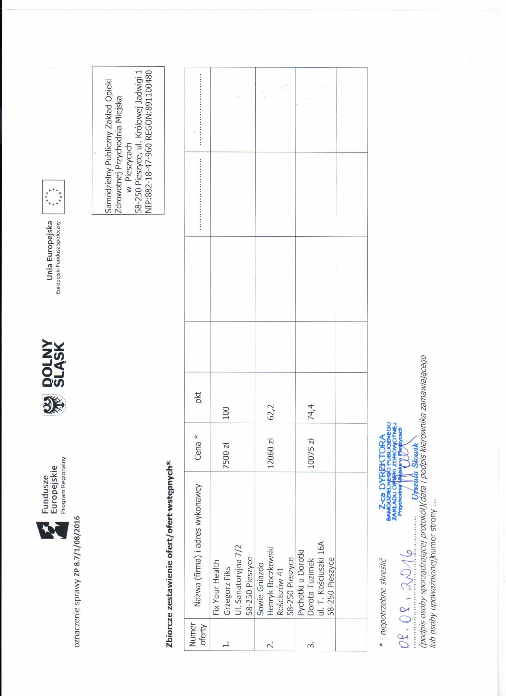 5. Zapytanie ofertowe - spotkanie Kudowa Zdrój - Zestawienie ofert - Informacja o wyborze najkorzystniejszej oferty