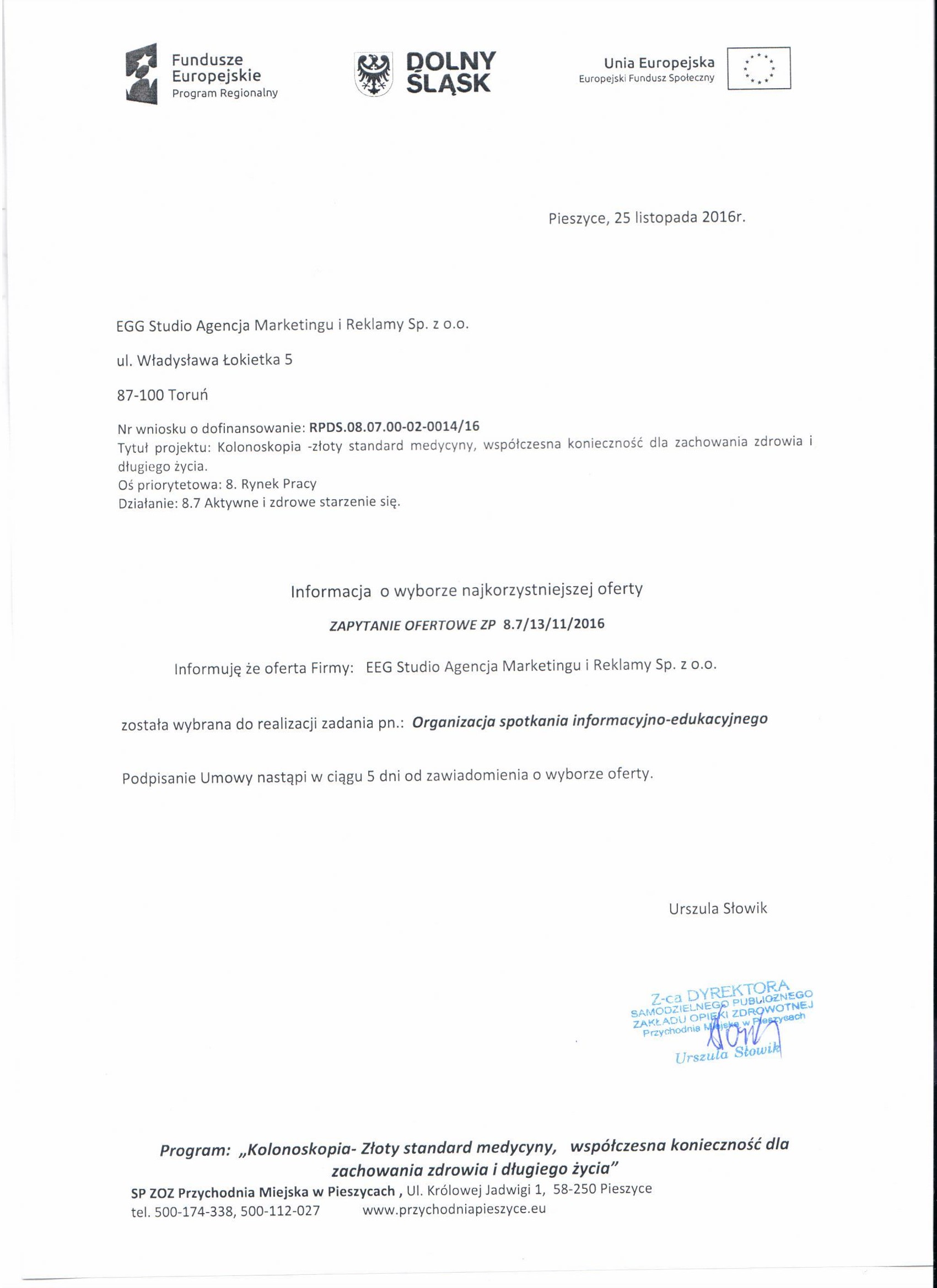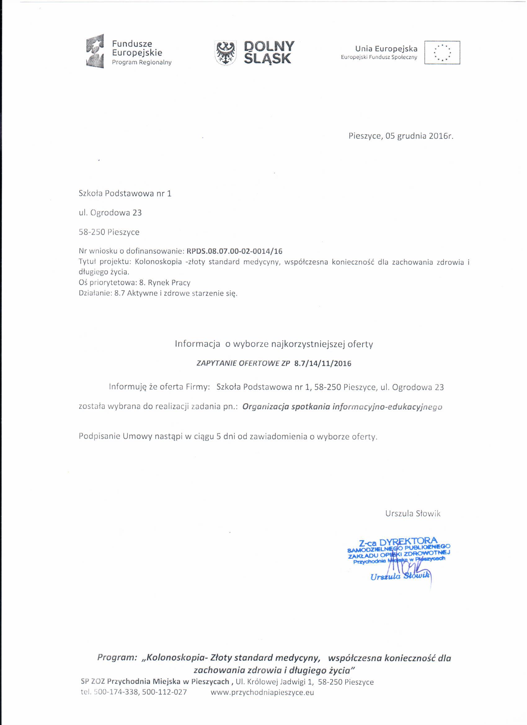 1. ZAPYTANIE OFERTOWE - SOBOTA KOLONOSKOPOWA - Zestawienie ofert -Informacja o wyborze najkorzystniejszej oferty