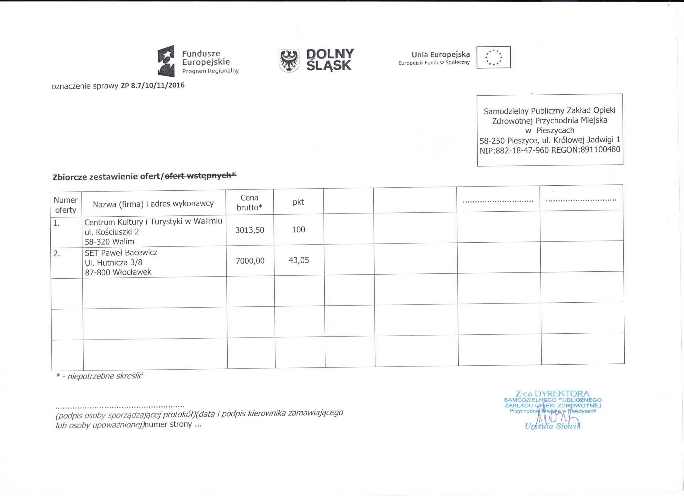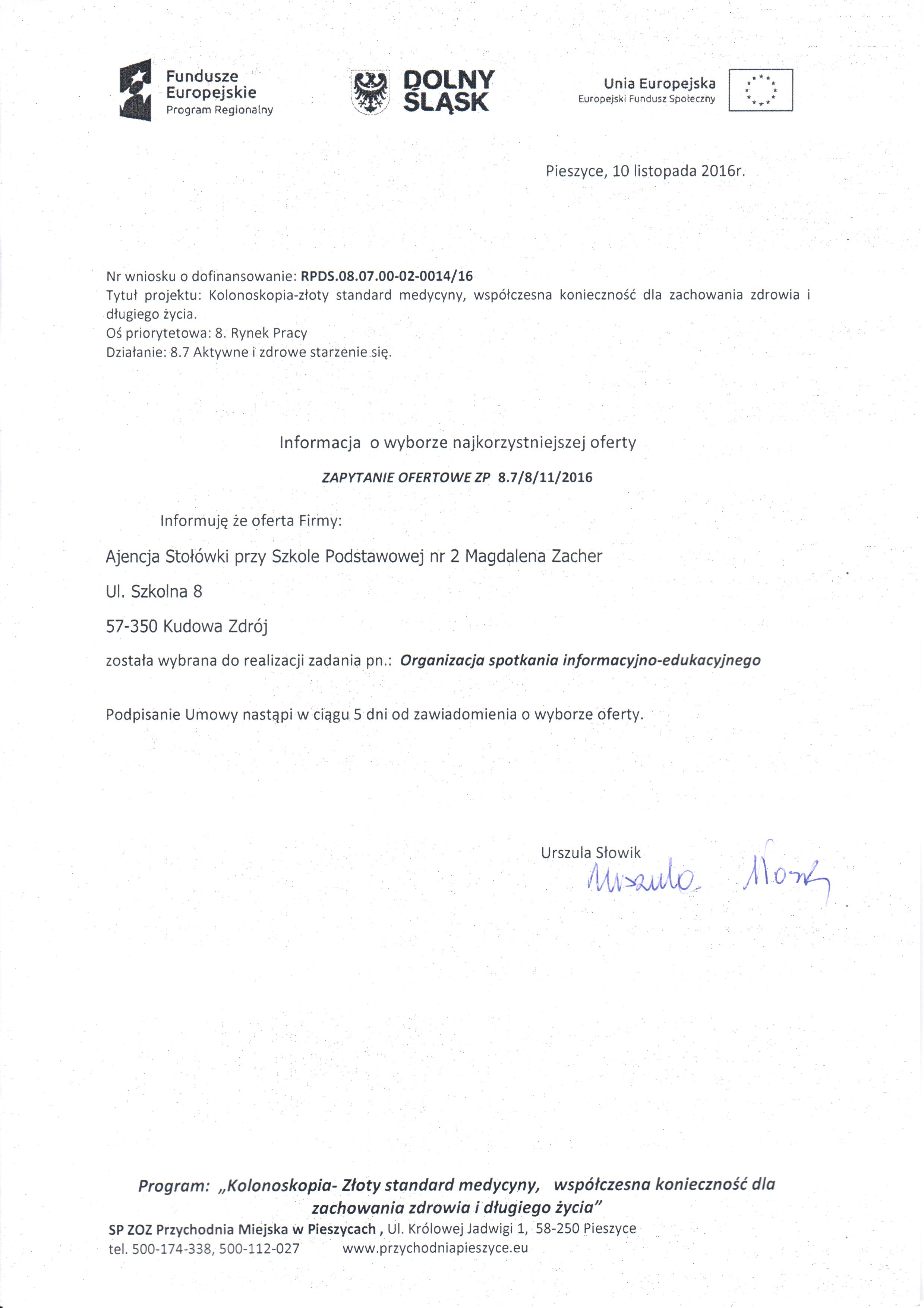 8. Zapytanie ofertowe - spotkanie Walim - Zestawienie ofert - Informacja o wyborze najkorzystniejszej oferty