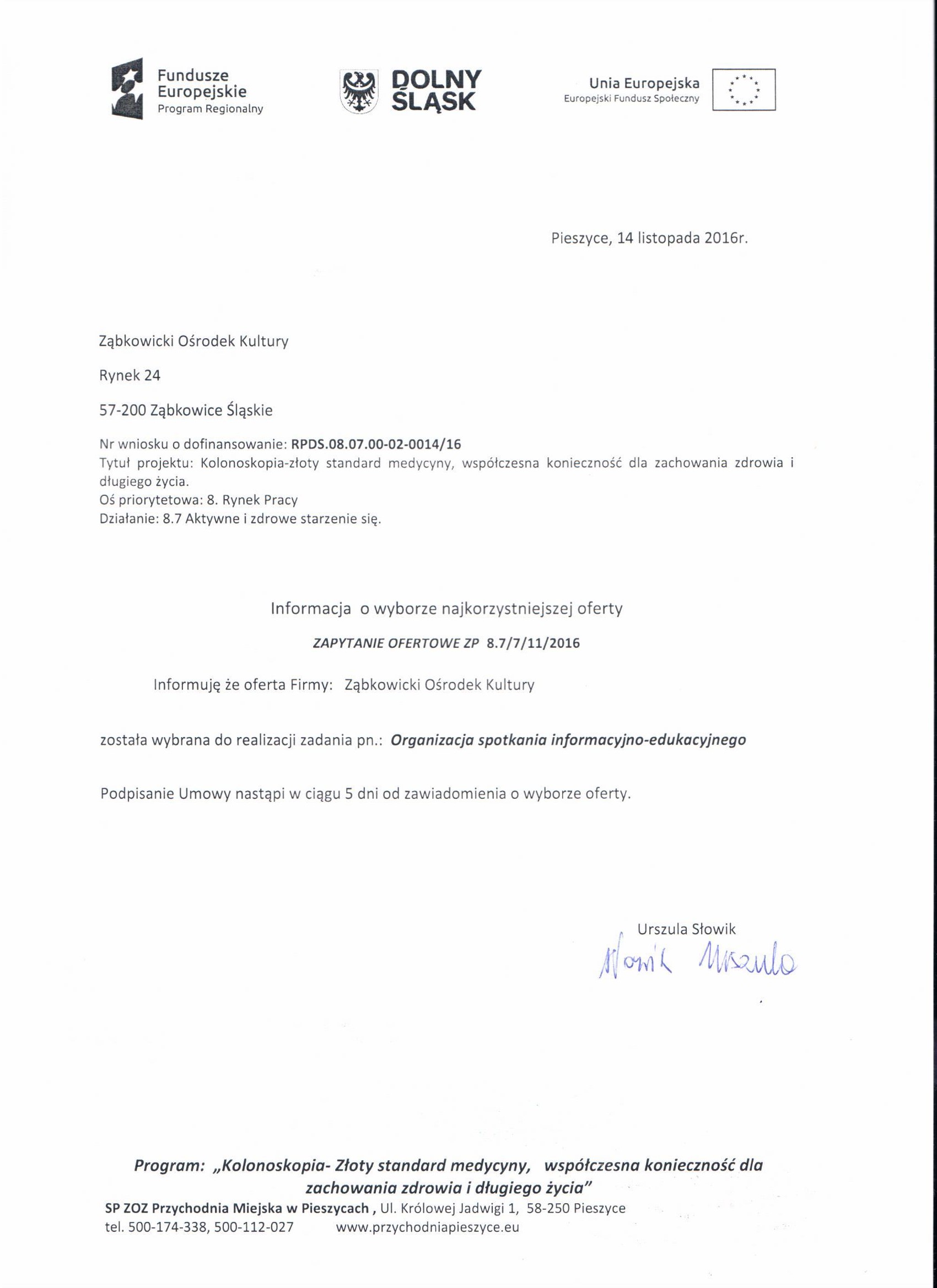 6. Zapytanie ofertowe - spotkanie Ząbkowice Śląskie - Zestawienie ofert - Informacja o wyborze najkorzystniejszej oferty